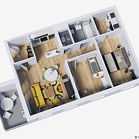 Raumaufteilung: große Wohnküche, 2 Schlafzimmer, Abstellraum, modernes Badezimmer mit Wanne sowie einer…