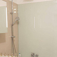 Die Wohnung ist neu renoviert und mit Glaswänden in Bad und Küche ausgestattet.