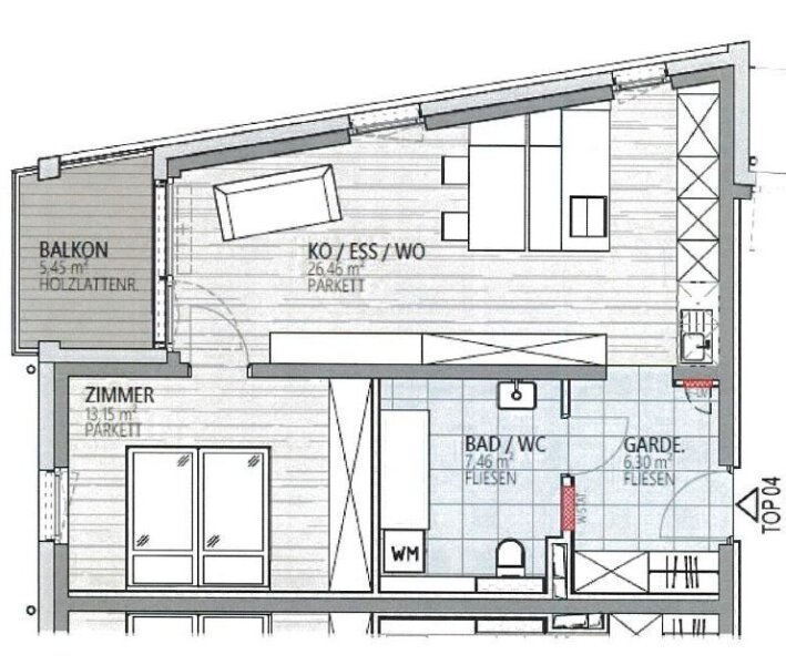 Raumaufteilung TOP 04 / 2 ZI-1.OG KP € 317.000,--