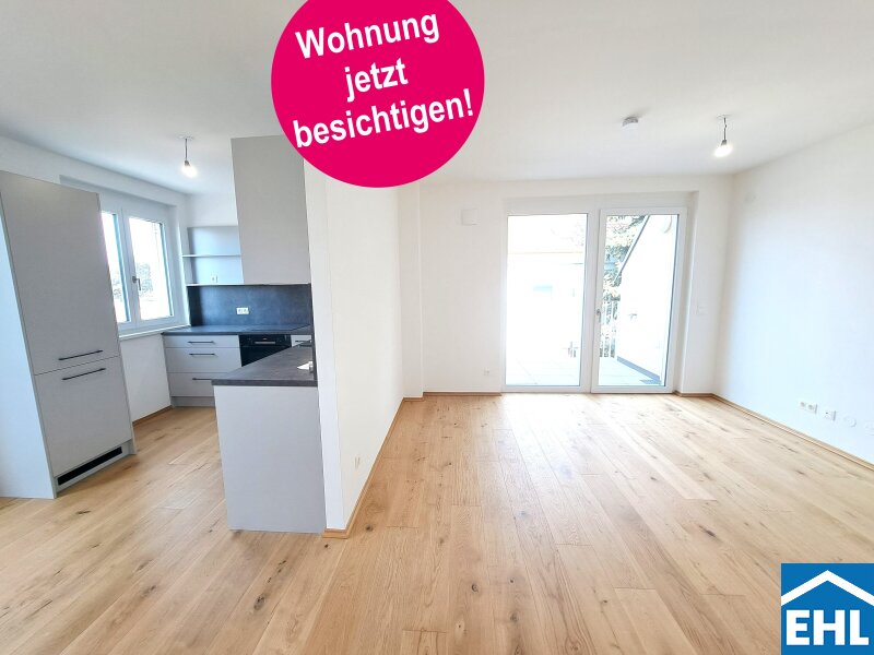 Hier stehen 83 attraktive, bereits bezugsfertige Wohnungen, umgeben von großzügigen Freiflächen, zum Verkauf. Ob mit einem gemütlichen Eigengarten, Balkon oder Terrasse – diese neue Wohnhausanlage bietet für jeden Wunsch die perfekte Außenfläche.