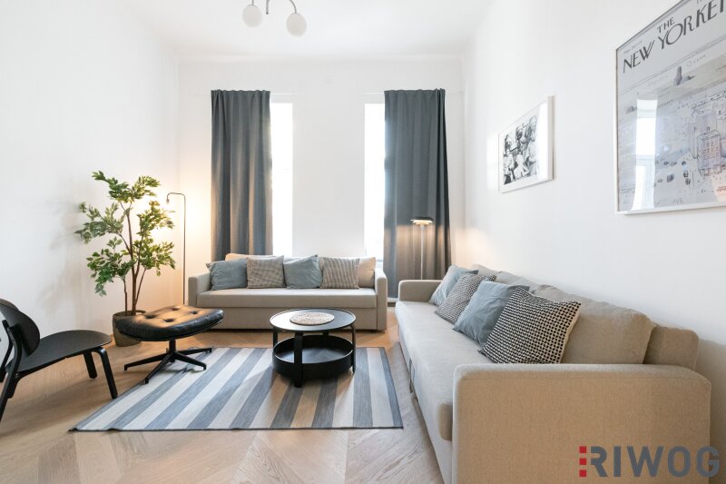 Die sehr gepflegte Wohnung befindet sich im Erdgeschoß. Exklusive Fliesen im Großformat, schwarze Steinberg Armaturen und ein eleganter französischer Fischgrätparkettboden sowie weiße Kasettentüren im "Alt Wien" Stil unterstreichen den zeitlosen und charmanten Charakter dieser Wohnung. Eine maßgefertigte moderne Markenküche mit Geräten sowie eine komplette stylische Möblierung machen diese Wohnung sofort benutzbar sowohl für die sofortige Verwendung als Apartment zur Kurzzeitvermietung (Airbnb) oder für alle die gleich selbst einziehen möchten.