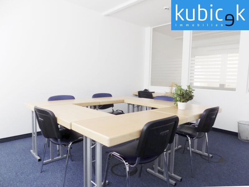 Dieser Schulungs-/Seminarraum Nr. 1 hat ein Ausmaß von 19,03 m² und ist mit einem großen Tisch, sieben Stühlen und einem separaten kleinen Tisch ausgestattet.
