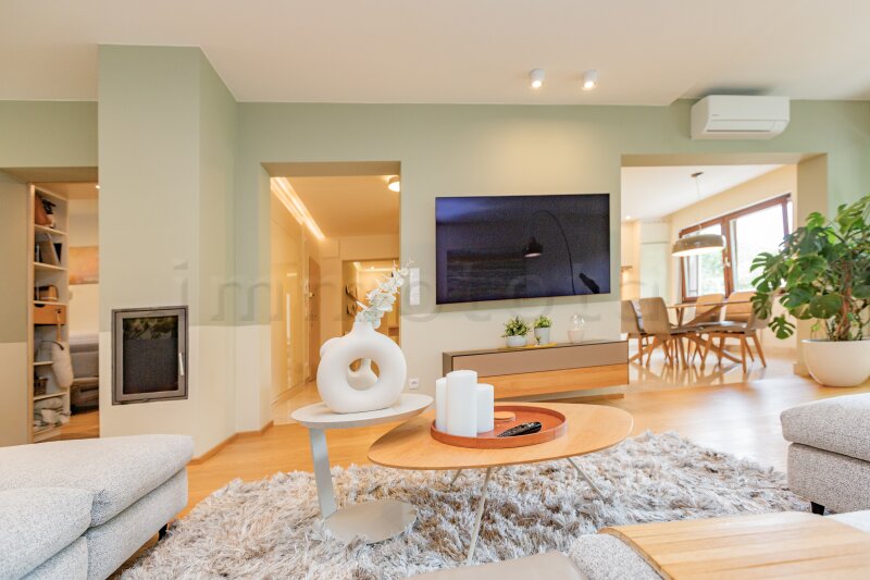 Im Jahr 2019 wurde die Wohnung aufwendig und stilvoll saniert: Die offen gestaltete Wohnküche ist mit einer hochwertigen HAKA-Einbauküche samt Miele-Geräten und Induktions-Wok-Mulde ausgestattet. Der Essbereich bildet eine gelungene Verbindung zum weitläufigen Wohnzimmer und betont den offenen Wohncharakter der Wohnung. Das moderne Bad mit Walk-in-Dusche und Badewanne, ein offener Kamin im Wohnzimmer sowie durchdachte, designorientierte Ausstattungselemente verleihen der klimatisierten Wohnung eine exklusive Atmosphäre.