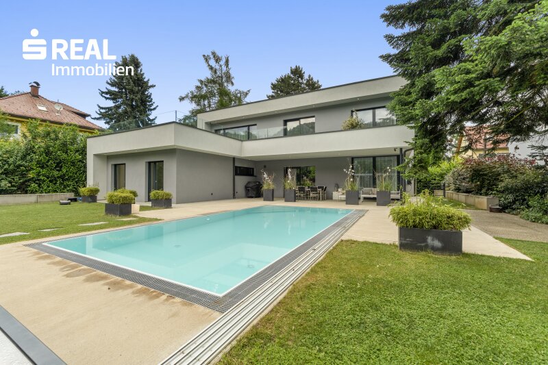 Zum Verkauf gelangt diese hochwertig ausgestattete und voll eingerichtete Villa mit 5 Zimmern in ruhiger Lage umgeben von Einfamilienhäusern im beliebten Bezirk Wetzelsdorf mit einer Nutzfläche von ca. 187,33 m². Das Gebäude vereint modernen Komfort sowie technische Ausstattung mit einem beheizbaren Infinity-Pool und eigenem ebenfalls voll ausgestatteten Pool/Gästehaus auf einem ebenen Grundstück von ca. 1.238 m². Beheizt werden die Gebäude mittels Luftwärmepumpe mit Fußbodenheizung. Eine komfortable Deckenkühlung sorgt zusätzlich im Sommer für angenehme Temperaturen. Die Gebäude wurden 2020 errichtet. Die Möglichkeit für zwei getrennte Wohneinheiten wurde ebenso bei der Planung berücksichtigt wie eine besondere Architektur und eine beeindruckende Raumhöhe im Wohnbereich von ca. 6 m mit elektrischem Vorhang vor der Fensterfront mit Blick auf das Grundstück.