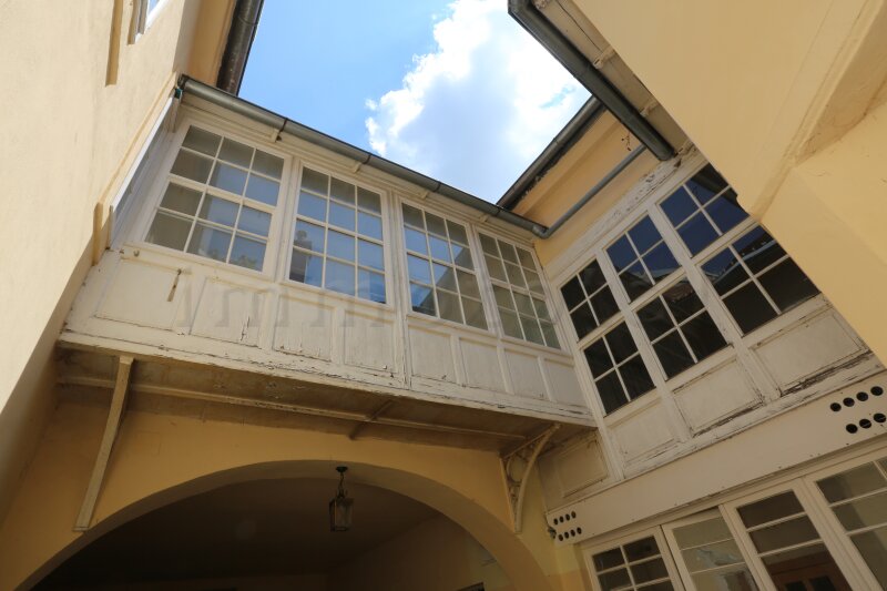 Der Zugang erfolgt über einen überdachten Innenhof und eine Holztreppe von der man in das großzügige Stiegenhaus gelangt.