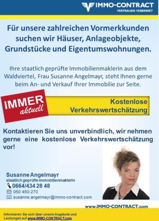 Wenn auch Sie eine Immobilie zu verkaufen oder zu vermieten haben, würden wir uns freuen, diese unseren vorgemerkten Suchkunden präsentieren zu dürfen. Für eine kostenlose Verkehrswertschätzung sowie eine umfassende Beratung rund um Ihre Immobilie kontaktieren Sie bitte Ihre Immobilienmaklerin aus dem Waldviertel Susanne Angelmayr 0664/4342848.Angaben gemäß gesetzlichem Erfordernis: