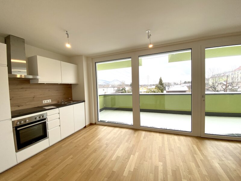 Neu errichtete Wohnung mit angenehmer Wohnatmosphäre und durchdachter Raumaufteilung: Vorraum, Bad (Waschbecken und Badewanne von Laufen, Waschmaschinenanschluss), große Wohnküche mit vollausgestatteter Küchenzeile von Juno (Herd, Backrohr, Kühlschrank, Geschirrspüler) und Zugang zu großzügigem Balkon (teilweise überdacht); zwei getrennt begehbare Zimmer, eines mit Zugang zum Balkon. Hochwertige Ausstattung (Eichenparkett, Feinsteinzeug), Fenster mit Mehrfachverglasung, elektrische Außenjalousien.