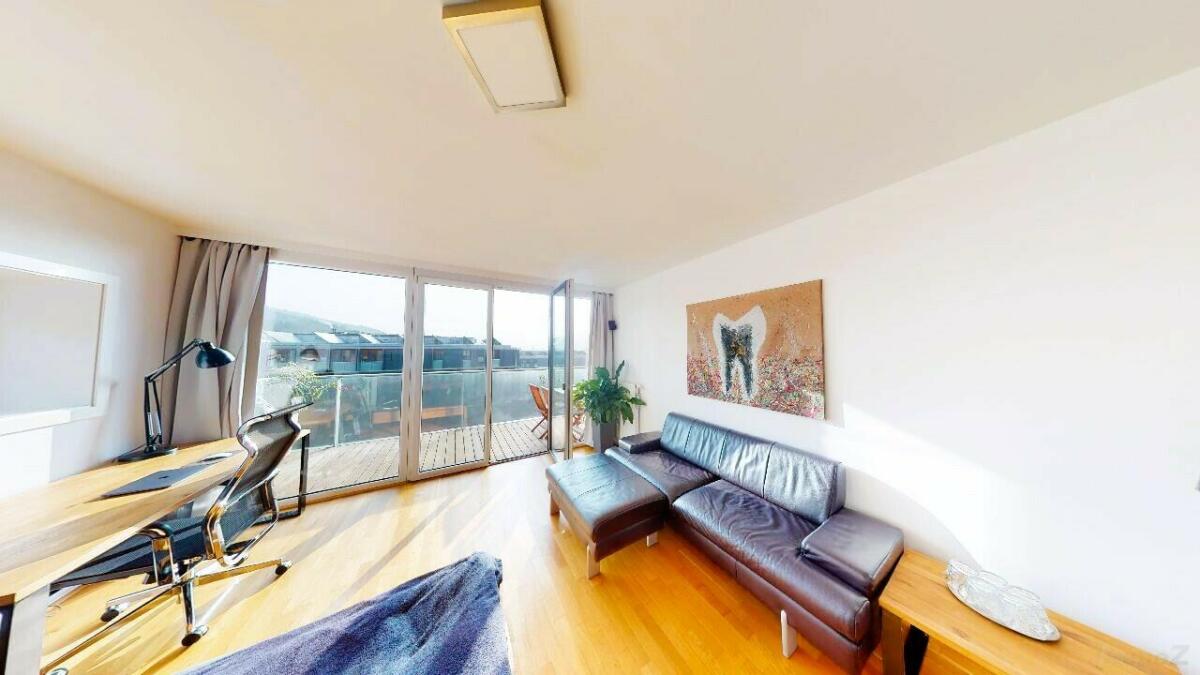 Der Wohnraum ist durch die durchgehende Glasfront sowie zusätzliche Fenster besonders lichtdurchflutet, wodurch sich eine besondere Wohlfühlatmosphäre einstellt.