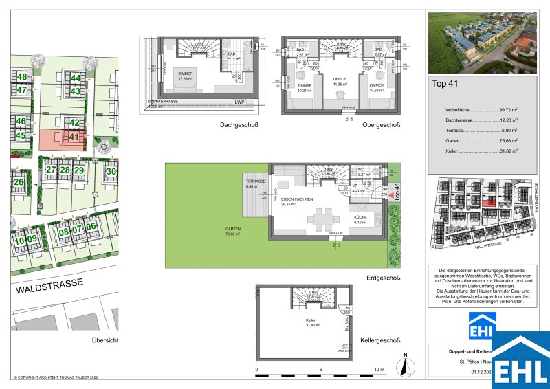 Die Häuser verfügen über drei Etagen, wobei in den meisten Einheiten ein zusätzliches Kellergeschoß ausgeführt wird. Die Wohnflächen variieren zwischen 99 und 109 m² und bieten mit 4 Zimmern ausreichend Platz und Komfort für eine Familie. Großzügige Freiflächen in Form von Gärten, Terrassen und Dachterrassen laden zum Entspannen und Genießen ein. Hier können Sie Ihren grünen Daumen entfalten und entspannte, gesellige Stunden mit Freunden und Familie erleben. Für jede Wohneinheit sind zudem 2 Tiefgaragenplätze vorgesehen, die bequem erreichbar und schon im Kaufpreis inbegriffen sind.