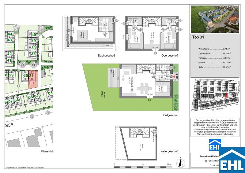 Die Häuser verfügen über drei Etagen, wobei in den meisten Einheiten ein zusätzliches Kellergeschoß ausgeführt wird. Die Wohnflächen variieren zwischen 99 und 109 m² und bieten mit 4 Zimmern ausreichend Platz und Komfort für eine Familie. Großzügige Freiflächen in Form von Gärten, Terrassen und Dachterrassen laden zum Entspannen und Genießen ein. Hier können Sie Ihren grünen Daumen entfalten und entspannte, gesellige Stunden mit Freunden und Familie erleben. Für jede Wohneinheit sind zudem 2 Tiefgaragenplätze vorgesehen, die bequem erreichbar und schon im Kaufpreis inbegriffen sind.