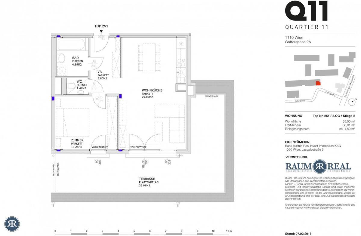 Die Wohnungen im QUARTIER 11 zeichnen sich durch eine Vielfalt an unterschiedlichen Grundrissen und Größen von 43 bis 100 m2 aus. Wählen Sie das Wohnungslayout, das am besten zu Ihnen und Ihrer Zukunftsplanung passt. Ob 1-, 2-, 3- oder 4-Zimmer-Wohnung – alle Wohnbereiche sind bis ins Detail geplant. Jede Wohnung verfügt entweder über Garten, Balkon, Loggia oder Terrasse. Wir haben alle Wohnungen mit modernsten Maßküchen inklusive Geräten, Parkettböden und alle Fenster mit Außenjalousien ausgestattet. Und das Beste ist: alle Wohnungen sind gekühlt.Detaillierte Infos über alle freien Wohnungen sowie Pläne finden Sie unter www.QUARTIER11.at.!!! Alle Innenaufnahmen sind Beispielfotos aus Wohnungen in diesem Projekt.Das Wohnareal QUARTIER 11 besteht aus 8 freistehenden Gebäuden und einem 10-geschoßigen Turm mit markanter Fassade. Großzügige Grünflächen und freundlich gestaltete Plätze verleihen diesem Wohnprojekt ein ganz besonderes Flair in Ruhelage. Die moderne Architektur kombiniert hier attraktives Design und angenehmes Wohngefühl für Ihr neues Zuhause.Das innovative Energiesystem KlimaLoop® mit seiner integrierten Deckenkühlung für alle Wohnungen setzt dabei neue Standards und sorgt für niedrige Energiekosten.Mietdauer: 10 Jahre befristet Kaution: 3 Bruttomonatsmieten Provision: 2 Monatsmieten + 20 % Ust. Garage: € 72,--/Monat (Kaution für Garage: € 220,--)Schicken Sie uns bitte eine Anfrage per Mail. Es werden nur Anfragen mit kompletter Namensnennung (Vor- und Zuname) sowie Telefonnummer beantwortet.Nach Erhalt Ihrer Anfrage übermitteln wir Ihnen das Angebot und können dann gerne eine Besichtigung vereinbaren.Bitte beachten Sie, dass bei Wohnungen, die erst frei werden, eine Besichtigung nur in Abstimmung mit dem/der derzeitigen Mieter/in stattfinden kann.Infrastruktur / EntfernungenGesundheit Arzt <2.000m Apotheke <500m Klinik <4.500m Krankenhaus <4.000m Kinder & Schulen Schule <500m Kindergarten <500m Universität <3.000m Höhere Schule <3.500m Nahversorgung Supermarkt <500m Bäckerei <1.000m Einkaufszentrum <1.500m Sonstige Bank <1.000m Geldautomat <1.000m Post <1.000m Polizei <500m Verkehr Bus <500m U-Bahn <1.000m Straßenbahn <500m Bahnhof <1.000m Autobahnanschluss <2.500m Angaben Entfernung Luftlinie / Quelle: OpenStreetMap