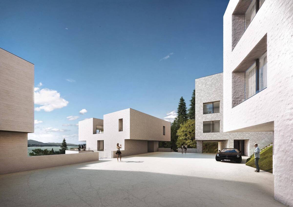 VILLEN AM SEE mit Seeblick In Lochau (Bregenz) am Bodensee wird in einzigartiger Hanglage am Pfänder oberhalb der Bregenzer Bucht, das exklusive Wohnprojekt VILLEN AM SEE mit Seeblick realisiert. Auf dem Grundstück werden vier einzelne Villen mit einer gemeinsamen Garage errichtet. Zur Verfügung stehen Wohnflächen von 50 bis 245 m² oder eine gesamte Villa. Der Naturraum ist die Dominante des Ensembles der vier VILLEN AM SEE am Pfänderhang. Er drückt sich in der Topografie des Hanges aus, der den Objekten Rückhalt und Kraft gibt. Jede Villa hat ihre eigene Textur, ist eine eigene expressive Persönlichkeit innerhalb des Verbunds. Die Baukörper verbinden sich in bestimmten architektonischen Prinzipien, beharren aber deutlich erkennbar auf Eigensprachlichkeit. Ihr trapezförmiger Grundriss öffnet sich zum Bodensee hin, verjüngt sich dem Berg zu, um anderen und anderem Platz zu geben. Die Vielschichtigkeit der Wahrnehmung Wie dem Ort der Begegnung, ein Plateau, das die vier Gebäude im ständigen Dialog hält. Die Ausrichtung der großzügigen Terrassen und Loggien führt zu ganz unterschiedlichen Wahrnehmungen der Umgebung. Mit deren Rundum-Orientierung werden die Perspektiven nach allen Seiten spannend - sie wechseln mit dem Standort, von innen nach außen, von Westen nach Osten. Abwechslung und damit Bereicherung liegt im Auge des Betrachters. Die VILLEN AM SEE sind eine Einladung an die künftigen Besitzer, den Innenraum aktiv mitzugestalten, persönliche Prioritäten miteinzuplanen und -bauen. Die exklusiven Villen haben von Natur aus einen starken Hang zur Selbstverwirklichung von Träumen. Wohnen am Bodensee Von den VILLEN AM SEE breitet sich ein hoch- wie breitgradiges Spektrum an Kultur-, Sport- und Freizeitangeboten aus: die Festspielbühne auf 125° - Festspielsaison ist im Juli und August mit großer Oper, großem Theater. Die Halbinsel Lindau auf 67°, immer einen Ausflug wert - mit dem Raddampfer Hohentwiel ein Erlebnis (Hafen auf 140°). Das KUB auf 245° - das Kunsthaus Bregenz ist schon architektonisch ein Kunstwerk. Der Kornmarktplatz (150°) als Flaniermeile mit Cafés und Restaurants, mit Theater und vorarlberg museum. Der Pfänder auf 225°, der Hausberg der Bregenzer mit Wildpark und Adlerwarte. Das Nostalgiebad Mili und das Strandbad liegen auf 140°. Die mittelalterliche Oberstadt mit Martinsturm (155°). Yacht- und Segelclub in Sicht auf 119°. Der Haggen auf 281° - sportlich zu Fuß in 20 Minuten erreichbar. Der Radweg rund um den Bodensee auf 90°. Macrolage wie Microlage mit der mediterranen Villa Grafenreuth und dem Klausturm beeindrucken.