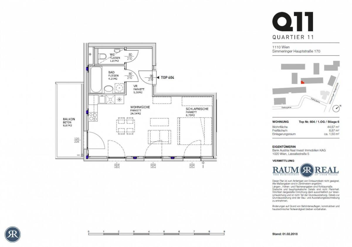 Die Wohnungen im QUARTIER 11 zeichnen sich durch eine Vielfalt an unterschiedlichen Grundrissen und Größen von 43 bis 100 m2 aus. Wählen Sie das Wohnungslayout, das am besten zu Ihnen und Ihrer Zukunftsplanung passt. Ob 1-, 2-, 3- oder 4-Zimmer-Wohnung – alle Wohnbereiche sind bis ins Detail geplant. Jede Wohnung verfügt entweder über Garten, Balkon, Loggia oder Terrasse. Wir haben alle Wohnungen mit modernsten Maßküchen inklusive Geräten, Parkettböden und alle Fenster mit Außenjalousien ausgestattet. Und das Beste ist: alle Wohnungen sind gekühlt.Detaillierte Infos über alle freien Wohnungen sowie Pläne finden Sie unter www.QUARTIER11.at.!!! Alle Innenaufnahmen sind Beispielfotos aus Wohnungen in diesem Projekt.Das Wohnareal QUARTIER 11 besteht aus 8 freistehenden Gebäuden und einem 10-geschoßigen Turm mit markanter Fassade. Großzügige Grünflächen und freundlich gestaltete Plätze verleihen diesem Wohnprojekt ein ganz besonderes Flair in Ruhelage. Die moderne Architektur kombiniert hier attraktives Design und angenehmes Wohngefühl für Ihr neues Zuhause.Das innovative Energiesystem KlimaLoop® mit seiner integrierten Deckenkühlung für alle Wohnungen setzt dabei neue Standards und sorgt für niedrige Energiekosten.Mietdauer: 10 Jahre befristet Kaution: 3 Bruttomonatsmieten Provision: 2 Monatsmieten + 20 % Ust. Garage: € 72,--/Monat (Kaution für Garage: € 220,--)Schicken Sie uns bitte eine Anfrage per Mail. Es werden nur Anfragen mit kompletter Namensnennung (Vor- und Zuname) sowie Telefonnummer beantwortet.Nach Erhalt Ihrer Anfrage übermitteln wir Ihnen das Angebot und können dann gerne eine Besichtigung vereinbaren.Bitte beachten Sie, dass bei Wohnungen, die erst frei werden, eine Besichtigung nur in Abstimmung mit dem/der derzeitigen Mieter/in stattfinden kann.Infrastruktur / EntfernungenGesundheit Arzt <2.000m Apotheke <500m Klinik <4.500m Krankenhaus <4.000m Kinder & Schulen Schule <500m Kindergarten <500m Universität <3.000m Höhere Schule <3.500m Nahversorgung Supermarkt <500m Bäckerei <1.000m Einkaufszentrum <1.500m Sonstige Bank <1.000m Geldautomat <1.000m Post <1.000m Polizei <500m Verkehr Bus <500m U-Bahn <1.000m Straßenbahn <500m Bahnhof <1.000m Autobahnanschluss <2.500m Angaben Entfernung Luftlinie / Quelle: OpenStreetMap