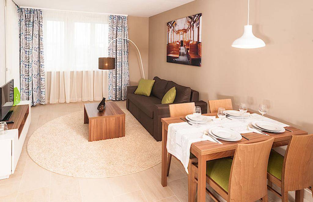 Das modern ausgestattete Apartment mit einer Größe von 45 qm eignet sich perfekt für Geschäftsreisende. Das separate Schlafzimmer mit Doppelbett bietet Ihnen hohen Wohnkomfort während Ihres Aufenthalts in Wien.Das Wohnzimmer ist mit einer ausziehbaren Couch und einem Esstisch für bis zu 4 Personen ausgestattet. Im Wohnzimmer befindet sich außerdem ein Fernseher mit SAT-TV. Vom Wohnzimmer aus haben Sie Zugang zu dem gemütlichen Balkon des Apartments. Im Vorraum des Apartments befindet sich ein separater Abstellraum.
