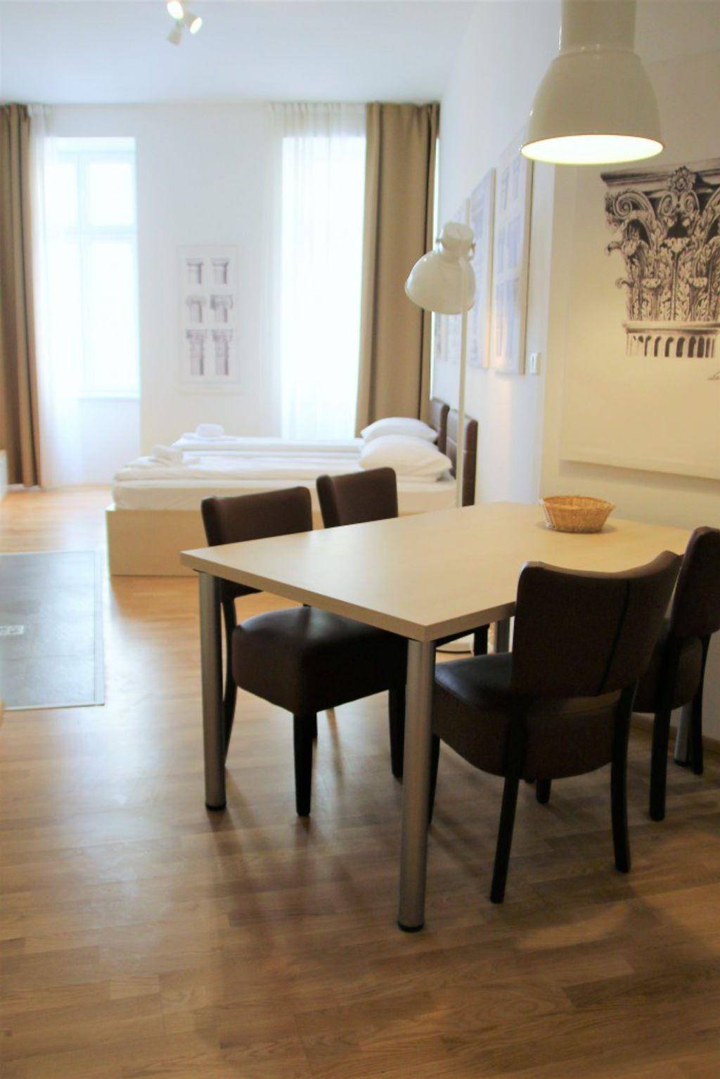 Gründerzeithaus und sind die ideale Basis für ihren Wien-Aufenthalt. Die intelligente Raumgestaltung schafft getrennte Bereiche für Schlafen, Kochen und Wohnen und bietet somit für Home Office ebenso Platz wie für private Treffen.Voll ausgestattete Küchen inklusive Besteck, Geschirr, Töpfe, Pfannen und Zubehör bieten dem Hobbykoch ausreichend Gestaltungsmöglichkeiten. Eine hauseigene Waschküche mit Waschmaschine und Trockner sind vorhanden.Highlight und Treffpunkt ist die große öffentliche Dachterrasse mit wunderschönem Blick über die Stadt.