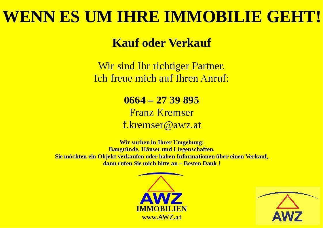 In Süßenbrunn, 1220 Wien, wird ein Objekt mit ca 1280m² und Abrißgenehmigung verkauft. !!! Share-Deal und Asset-Deal möglich !!! Auf diesen Objekt haben Sie die Möglichkeiten ein Projekt, von Reihenhäusern, Wohnungen oder eine Kombination davon, zu verwicklichen. Mit dem Bus kommen Sie in wenigen Minuten zur Schnellbahn bzw in weiter folge zur U1 Kagran. Autobahnanschluß A23/S1 ist nur wenige Autominuten erreicht. Anfragen bitte mit Firmennamen und Anschrift - DANKE Das persönliche Gespräch steht für uns an oberster Stelle. Zum Schutz unserer Auftraggeber versenden wir keine Pläne oder Unterlagen über das zu veräußernde Objekt vor einer Besichtigung! Nähere Informationen erhalten Sie bei Herrn Franz Kremser unter 0664 - 27 39 895. Aufgrund der Nachweispflicht gegenüber unserem Auftraggeber werden nur Anfragen mit vollständigen Kontaktdaten (Vor- und Familienname, Telefonnummer, Adresse, Email) bearbeitet bzw. Informationen erteilt. Haben Sie oder einer Ihrer Bekannten eine Immobilie zu verkaufen, dann freue ich mich auf Ihre Kontaktaufnahme. Weitere Immobilien/Fotos finden Sie auf https://www.AWZ.at