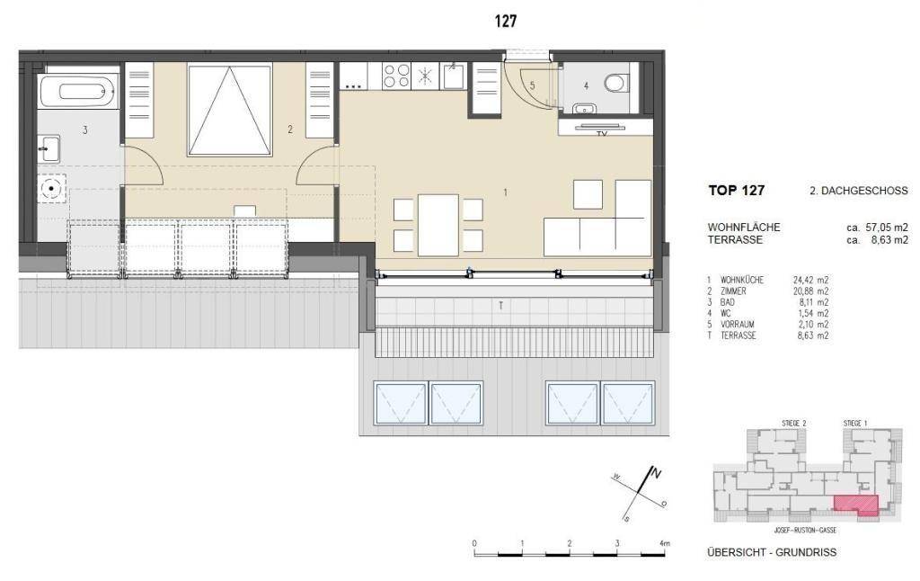 RESERVIERT WOHNEN UND INVESTIEREN IM GRÜNEN: Das neue Wohnhaus ist umgeben von Gärten. Es gruppiert 69 komfortable, provisionsfreie Eigentumswohnungen von 37 bis 109m2 auf vier Etagen um zwei offene Innenhöfe. Die anspruchsvolle Ausstattung reicht von edlen Materialien bis zur Smart Home-Technologie. Die Kaufpreise für Endkunden (Eigennutzer) starten ab EUR 159.500,- für knappe 37m². Eine vollständige Liste inkl. Preise für verfügbare Wohnungen gibt es auf Anfrage. Geplante Fertigstellung: 2021 Die gegenständliche Wohnung hat ca. 57,05m² für einen Preis von EUR 259.283,- Für Investoren: EUR 233.444,- netto Garagenplatz: EUR 21.100,- Garagenplatz für Investoren: EUR 19.186 Benefits & Goodies: + 2 Zimmer mit knapp 25m² Wohnküche + Terrassenfläche mit ca. 8,36m² + Fußbodenheizung + in wenigen Minuten zu Fuß zur Neuen Donau! + Merkur, Spar LIDL und Billa in Fußweite + Arzt und Apotheke ebenso in Fußweite + wenige Autominuten entfernt von Einrichtungshäusern und Baumärkten oder auch dem SCN + Busse in Gehweite + A22 Donauuferautobahn in 6 Minuten mit dem Auto zu erreichen + Tiefgaragenplatz OPTIONAL Die Lage ist ideal für Kinder In einer Sackgasse zwischen zwei Kleingartensiedlungen nahe der Neuen Donau und Wiens größtem und beliebtestem Freizeitareal, der Donauinsel. Hier am Nordrand Wiens wohnt man mit optimalem Preis-Leistungs-Verhältnis im Grünen, ohne auf die gute Nahversorgung der Stadt verzichten zu müssen. Nahversorgung In nur 7 Minuten erreicht man zu Fuß den Merkur-Supermarkt, die Apotheke und den praktischen Arzt. In bis zu 12 Minuten Fußweite befinden sich auch ein Spar, LIDL und Billa Supermarkt. Mit dem Auto erreicht man in 7-9 Minuten die Möbelhäuser Lutz und Möbelix, einen Media Markt, OBI Baumarkt und für Shoppingtouren das SCN Shopping Center Nord. Verkehrsanbindung Die Autobuslinien 34A und 36A liegen 7 Gehminuten entfernt. Öffentlich ist man zur U6 Station Floridsdorf, zu den Schnellbahnen S1, S2, S3, S4, S7 und zu den Zügen des Fernverkehrs 18 Minuten unterwegs. Mit dem Auto erreicht man die A22 Donauufer-Autobahn in 6 Minuten, den Flughafen in 22 Minuten. Ein Radweg führt unmittelbar an der Gartensiedlung vorbei nach Floridsdorf oder zum Uferweg der Neuen Donau. Ausstattung • Hauseigene Tiefgarage • Grünflächen • Top Infrastruktur • Loggia oder Balkon • Eigengarten (je nach Typ) Irrtümer und Druckfehler vorbehalten.Angaben gemäß gesetzlichem Erfordernis: Heizwärmebedarf: 34.01 kWh/(m²a) Klasse Heizwärmebedarf: B Faktor Gesamtenergieeffizienz: 0.9 Klasse Faktor Gesamtenergieeffizienz: A Kontakt: Mag. Christian Gölles 0699 110 79 565 cg@etera-immobilien.at Etera Immobilien Consulting - Experience Excellence