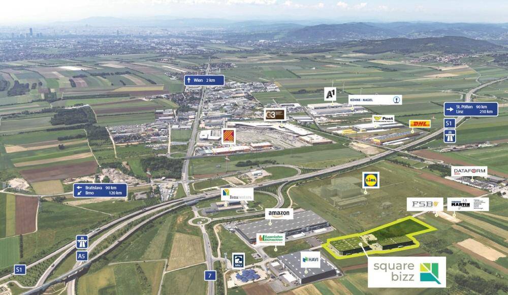 ECKDATEN: Halle 1 Ost3.600 m² Halle 2 West2.000 m² Mietflächen flexibel abteilbar von 450 - 3.000 m². Büro- und Sozialräumlichkeiten werden je nach Bedarf individuell für den Mieter realisiert. KONDITIONEN: Lager:€ 6,85 / m² Büro:€ 9,00 / m² Außenanlagen:€ 1,30 / m² Parkplatz:€ 40,00 / Stk. BK-Vorauszahl.:€ 0,85 / m² Kaution:3 Brutto-Monats-Mieten Provosion:3-Brutto-Monats-Mieten Mietlaufzeit:ab 5 Jahren BESCHREIBUNG: Das Squarebizz Business Center Eisenbrunn ist unmittelbar vor den Toren Wiens in Großebersdorf gelegen, mit einer ausgezeichneten Anbindung an die A5 nach Brünn/ Prag und an die Wiener Außenringautobahn S1 mit weiterführenden Anbindungen nach St. Pölten, Linz, etc. Die Gewebeflächen biete eine Raumhöhe von > 7,5m, sowie mehrere Senktionaltore für die Zu-/ Ablieferung per LKW. VERFÜGBARKEIT: Ab 01.12.2020 KONTAKT: Patrick Huber Babenbergerstraße 9/7, 1010 Wien +43 676 / 764 69 76 phuber@dpcimmobilien.at