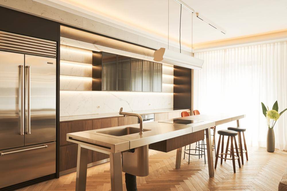 Unmittelbar neben der Wiener Staatsoper kommen Sie auf komplett renovierten 108 Quadratmetern gerne nach Hause: Das denkmalgeschützte 50er-Jahre-Haus inspirierte das anspruchsvolle Redesign der Wohnung im Vintage-Look mit edlen Materialien und erstklassigen Marken. Die Neuinterpretation klassischer Materia- lien sorgt für einen niveauvollen Empfang. Indirekt beleuchtete Wandvertäfelungen aus amerikanischem Walnussholz und das Wiener Fischgrät-Parkett aus dezent gekalkter französischer Eiche definieren den Standard: klar, leicht, exzellent. Raumhohe Türen begleiten das Licht – zum Beispiel ins Wohnzimmer mit einem Kamin in zu- rückhaltender Sichtbetonverkleidung.