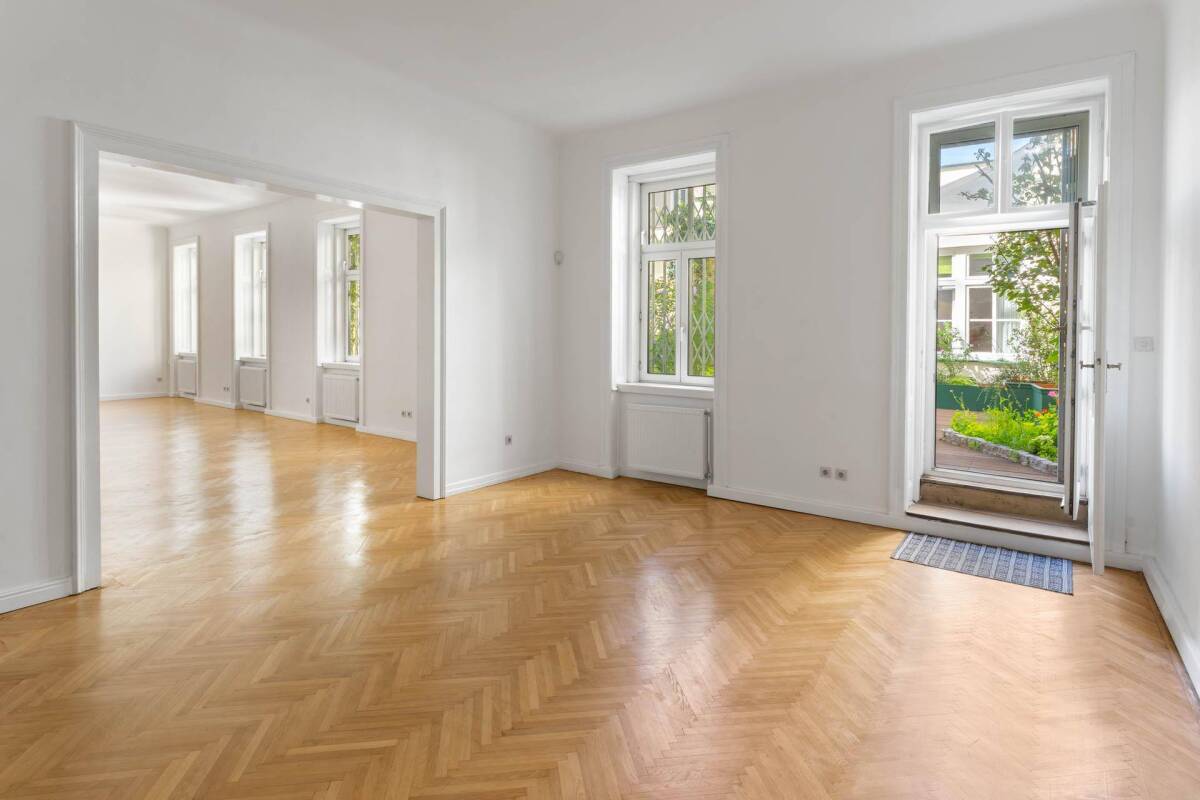 Diese repräsentative Altbauwohnung ist im 2. Liftstock eines 1911 errichteten Wohngebäudes gelegen. Sie erstreckt sich über eine Wohnfläche von knapp 179 qm und ist aufgeteilt in drei Zimmer, ein Kabinett, einen großzügigen Wohnsalon, Küche, WC, Bad, sowie einen Platz bietenden Vorraum mit Zugang zu einem praktischen Innenhof-Balkon. Die Wohnung beeindruckt mit stilvollen Fischgrät-Parkettböden im Wohnsalon und in den Zimmern sowie historischen Kachelöfen in selbigen Räumlichkeiten. Edle Flügeltüren, hohe Räume sowie große Fenster verleihen der Wohnung ein tolles Ambiente. Dank der optimalen Ost-West-Ausrichtung und Innenhoflage der Fenster genießt man ein lichtdurchflutetes Wohnerlebnis in absoluter Ruhelage. Als absolutes Highlight der Wohnung kann man den Zugang zur liebevoll begrünten Terrasse nennen, welche eine Fläche von ca. 35 qm bietet. Diese lädt zu jeder Jahreszeit zum erholsamen Verweilen ein und verschafft somit den perfekten Ausgleich zum oft hektischen Stadtleben. Die Räumlichkeiten der Sanitärbereiche und Küche wurden hochwertig grundsaniert, wobei Auswahl und Einbau der Einrichtung dem Käufer (auf eigene Kosten) obliegt. Der Wohnung ist zusätzlich ein praktisches Kellerabteil zugeordnet. Die monatlichen Betriebskosten der Wohnung belaufen sich auf EUR ca. 327,66 im Monat. Es besteht die Möglichkeit, die auf der gegenüber liegenden Seite der Terrasse befindliche Wohnung ebenfalls zu erwerben.
