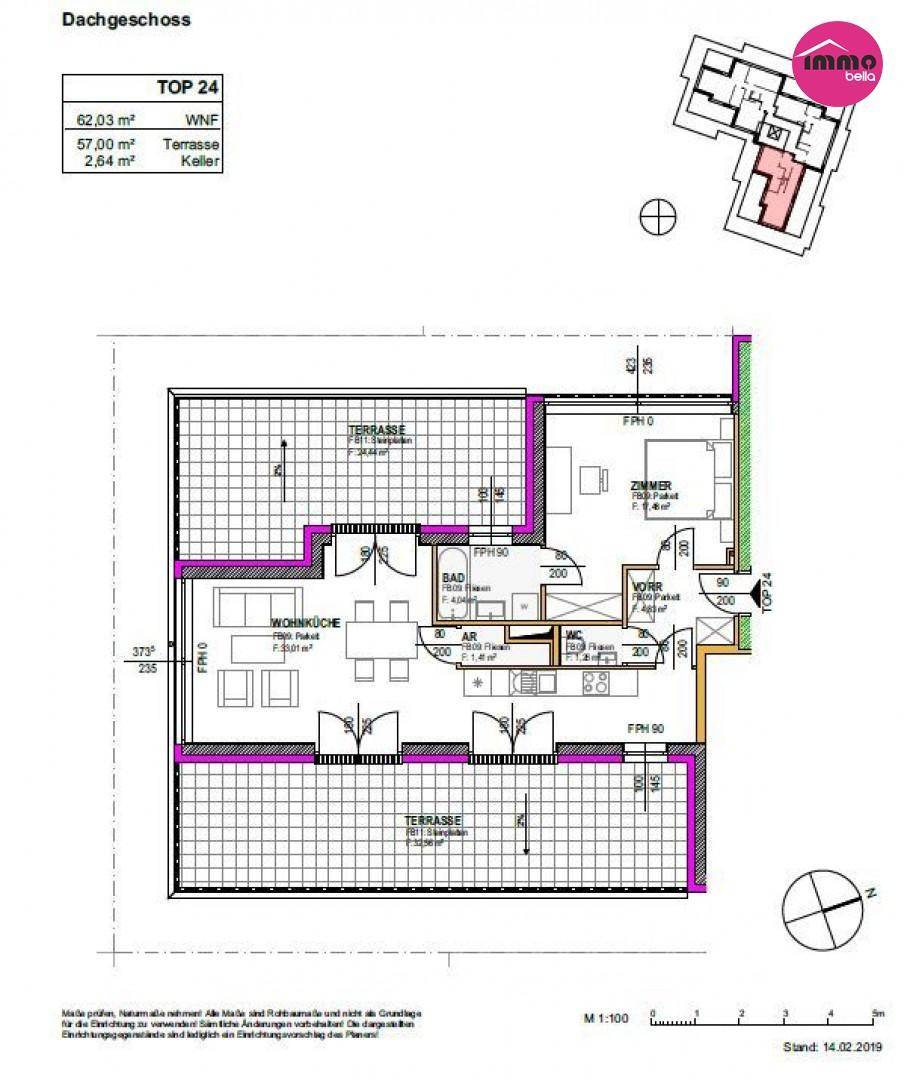 Zum Verkauf gelangen Wohnungen in einem Wohnhaus mit 26 freifinanzierten Wohnungen. Den Großteil der Wohneinheiten ist ein Freibereich (Balkon, Loggia oder Terrasse) zugeordnet. Die Erschließung erfolgt über ein zentrales Stiegenhaus mit behindertengerechten Aufzug. Im Erdgeschoß befinden sich der Müllraum und Kinder- Fahrradraum. Im Preis inkludiert ist auch ein Stellplatz in der Tiefgarage.Die Wohnungen verfügen nicht nur über hochwertige Parkettböden und bodentiefe Fenster, sondern auch die modernen Sanitäreinrichtungen, die bodenebene Dusche mit Regenbrause lassen das Bad zu Ihrer Wohlfühloase werden. Komfort und Annehmlichkeit bietet Ihnen auch die hauseigene Tiefgarage. Die Balkone und Terrassen sind mit echter sibirischer Lärche ausgestattet. Die 3-fach wärmeschutz-verglasten Kunststofffenster verfügen über elektrische Raffstore. Die Wohnungen sind ausgestattet mit einer Fußbodenheizung und in jedem Zimmer kann ein Splitgerät montiert werden, da die Klimavorbereitung schon in der Rohbauphase getroffen wurde.Alle Wohnungen werden bezugsfertig übergeben, d.h. alle Saniteranlagen, Fliesen und Parkettboden sind im Kaufpreis inkludiert. 20 PKW-Stellplätze stehen in der hauseigenen Tiefgarage zur Verfügung (bitte den Knopf "Garagenplatz aussuchen" unten betätigen).Preis Eigennutzer: DG, Top 24, 2 Zimmer WFL 62,03 m², Terrasse 57,00 m², Keller 2,64 m² Eigennutzer Preis: € 363.000,- (inkl.ein Garagenstellplatz) Betriebskosten: € 145,25-(Brutto) inkl. WNFL, Lift, Rücklage; (BK ParkPL €12,96-Brutto) Preis Investment:DG, Top 24, 2 Zimmer WFL 62,03 m², Terrasse 57,00 m², Keller 2,64 m² Anleger Preis - (inkl.ein Garagenstellplatz): € 338.800,-(Netto), € 406.560,-(Brutto) Betriebskosten: € 145,25-(Brutto) inkl. WNFL, Lift, Rücklage; (BK ParkPL €12,96-Brutto)Wir laden Sie sehr gerne zu einer Besichtigung ein - kontaktieren Sie uns!Besichtigungen auch am Abend, Samstag & Sonntag möglich! Für weitere Fragen oder Besichtigungsterminfestlegung, kontaktieren Sie bitte Darinka Hrnjez unter 0664 245 1473 Bitte beachten Sie, dass wir aufgrund der Nachweispflicht gegenüber dem Eigentümer nur Anfragen mit vollständigem Namen, Anschrift und Telefonnummer bearbeiten können und auch nur in diesem Falle Auskünfte über Objektunterlagen und die genauen Liegenschaftsadresse geben dürfen.!! Wir möchten Sie informieren – Maklervertrag (FAGG-Bestimmungen) !! „Alleine durch die Unterfertigung dieses Maklervertrages und die Besichtigung von Objekten entstehen Ihnen keine Kosten. Erst mit dem Abschluss eines Kaufvertrages und / oder eines Mietvertrages tritt Verdienstlichkeit ein und es wird die Provisionszahlungspflicht iSd Provisionsvereinbarung dieses Vertrages ausgelöst!“Bitte haben Sie dafür Verständnis, dass wir Ihnen seit dem 13. Juni 2014 aufgrund der neuen EU-Richtlinie Unterlagen und Informationen zu unseren Objekten erst dann übersenden können, wenn Sie bestätigen, dass Sie unser vorzeitiges Tätigwerden wünschen und über Ihre Rücktrittsrechte aufgeklärt wurden. Hierfür erhalten Sie nach Ihrer Anfrage eine Email mit den entsprechenden Unterlagen und einem Link, um diese Punkte zu bestätigen. Vielen Dank!Wir weisen ausdrücklich auf unser wirtschaftliches Naheverhältnis mit dem Abgeber/ der Abgeberin hin! Unsere gesetzlichen Pflichten als Doppelmakler werden dadurch jedoch nicht beeinträchtigt. Irrtum und Änderungen vorbehalten.Alle hier veröffentlichen Informationen basieren auf den uns von dem Abgeber/ der Abgeberin zur Verfügung gestellten Informationen und wurden nicht selbst erhoben.Der Schutz von personenbezogenen Daten ist uns wichtig und auch gesetzlich gefordert. Die Verarbeitung Ihrer personenbezogenen Daten erfolgt nach den datenschutzrechtlichen Bestimmungen. Auf unserer Homepage (unter Datenschutzinformation) finden Sie eine Übersicht die Sie über die wichtigsten Aspekte der Verarbeitung personenbezogener Daten informieren soll.Nebenkosten lt. Nebenkostenübersicht! Der Vollständigkeit halber halten wir fest, dass wir Ihnen bei Anmietung/Ankauf eines von uns namhaft gemachten Objektes durch Sie oder einen durch Sie namhaft gemachten Dritten bzw. bei beidseitiger Willensübereinstimmung eine Vermittlungsprovision in der Höhe von 3 Bruttomonatsmieten bei Gewerbeimmobilien, 2 Bruttomonatsmieten bei Wohnimmobilien bzw. 3 % des Kaufpreises zuzüglich der gesetzlichen Umsatzsteuer in Rechnung stellen (Honorarverordnung für Immobilienmakler, BGBl. Nr. 262 und 297/1996).Dieses Angebot ist unverbindlich und freibleibend. Die Angaben erfolgen aufgrund der Informationen und Unterlagen, die uns vom Eigentümer und/oder Dritten zur Verfügung gestellt werden und sind ohne Gewähr. Im Übrigen gelten die allgemeinen Geschäftsbedingungen sowie die Verordnung des BM für wirtschaftliche Angelegenheiten über Standes- und Ausübungsregeln für Immobilienmakler, BGBl 297/96.Alle Angaben im Angebot basieren auf Informationen und Unterlagen des Eigentümers und erfolgen nach bestem Wissen, jedoch ohne Gewähr auf Richtigkeit. Hinweis gemäß Energieausweisvorlagegesetz: Wir übernehmen keinerlei Gewähr oder Haftung für die tatsächliche Energieeffizienz der angebotenen Immobilie.Hinweis gemäß Energieausweisvorlagegesetz: Ein Energieausweis wurde vom Eigentümer bzw. Verkäufer, nach unserer Aufklärung über die ab 1.12.2012 geltende generelle Vorlagepflicht, sowie Aufforderung zu seiner Erstellung noch nicht vorgelegt. Daher gilt zumindest eine dem Alter und der Art des Gebäudes entsprechende Gesamtenergieeffizienz als vereinbart. Wir übernehmen keinerlei Gewähr oder Haftung für die tatsächliche Energieeffizienz der angebotenen Immobilie.Infrastruktur / EntfernungenGesundheit Arzt <1.250m Apotheke <500m Krankenhaus <7.250m Klinik <1.250m Kinder & Schulen Schule <500m Kindergarten <500m Universität <6.250m Höhere Schule <6.500m Nahversorgung Supermarkt <250m Bäckerei <1.250m Einkaufszentrum <1.250m Sonstige Bank <500m Gelda