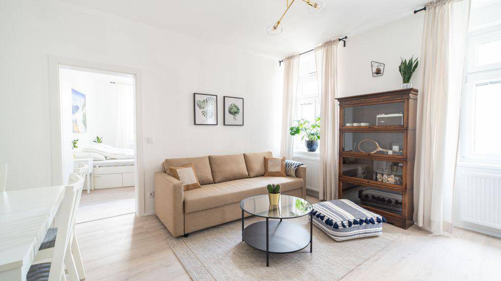Das Apartment ist im noblen und ruhigen 18. Wiener Bezirk gelegen und Teil eines entzückenden, neu renovierten Gründerzeithauses. Dieses klassisch-moderne Apartment bietet 4 Personen Platz und hat durch die hohen Räume sowie die geschmackvolle Einrichtung, inklusive einiger alter Wiener Zeichnungen aus den 1910er Jahren einen besonderen Charme. Innerhalb von nur 15 Minuten gelangt man ins Wiener Zentrum. Die geschmackvoll eingerichtete und neuwertig sanierte Wohnung besteht aus einem Schlafzimmer mit einer gemütlichen Leseecke, einer gut ausgestatteten offenen Wohnküche, einem Esstisch für 4 Personen, einem schönen Badezimmer mit einer großen Walk-In Dusche sowie einem separaten WC.Die große Couch im Wohnzimmer lässt sich schnell und einfach in einen bequemen Schlafplatz für 2 Personen verwandeln. Die umfassende Küchenausstattung besteht ua aus: Geschirrspülmaschine, Herd, Backofen, Mikrowelle, Wasserkocher, Toaster, Kaffeemaschine und Kühlschrank. In der Küche ist Alles vorhanden, was Du für einen gemütlichen Kochabend zu Hause brauchst. Das Bad ist sehr hochwertig und bietet viel Platz. Es ist ausgestattet mit einer großzügigen Walk-in-Dusche, einem Handtuchhalter mit Heizfunktion und einem großen Waschtisch. Neben dem Bad befindet sich das separate WC. Energieausweis Ausweis Typ: : Baujahr: 1877 Effizienzklasse: E Verbrauch: 140kWh / (m²a)