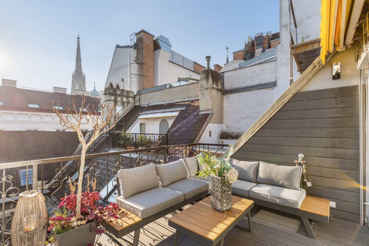 Diese exklusive Dachterrassen-Wohnung befindet sich in bester Lage am Lugeck. Das traditionelle Bürgerhaus mit fein gegliederter Fassade und geschichtsträchtigem Ambiente besticht mit seinem antiken Eingangsbereich aus Steinplatten mit Holzstöckel und gibt einen verträumten Blick auf verspielte Pawlatschengänge und Stuckelemente frei. In der hochwertigen Dachgeschoss-Wohnung angekommen, bietet eine Symbiose aus historischem Umfeld und qualitativer Ausstattung ein Wohngefühl auf höchstem Niveau. Unter Verwendung hochwertiger Materialien und moderner Technik wurde ein harmonisches Raumkonzept erschaffen, welches das Gesamtbild zwischen Tradition und klassischer Moderne komplettiert. Betritt man vom Vorzimmer den Wohnbereich, beeindruckt dieser sogleich durch dessen außergewöhnliche Großzügigkeit. Der Raum gliedert sich gelungen in die Bereiche Wohnen, Essen und Kochen. Der hohe Anspruch an Design und Qualität in Kombination mit ausgewählter Ausstattung - etwa der hervorragend designten Küche von Leo Schulmeister - ist augenfällig und setzt sich in der gesamten Wohnung fort. Auf gleicher Wohnebene befinden sich zwei attraktive Zimmer, die sich ein luxuriöses Badezimmer mit großformatigen Fliesen und ausgezeichneter Sanitärausstattung teilen. Einen Blickfang bildet die Treppe zur Galerie, über die man zum Hauptschlafzimmer mit angeschlossener Terrasse gelangt. Das Badezimmer en suite verwöhnt mit gediegenem Luxus. Von einer wohltuenden Ruhe ist man auf der großen Terrasse umgeben, die einen sagenhaften und nahen Blick auf den Stephansdom frei gibt.