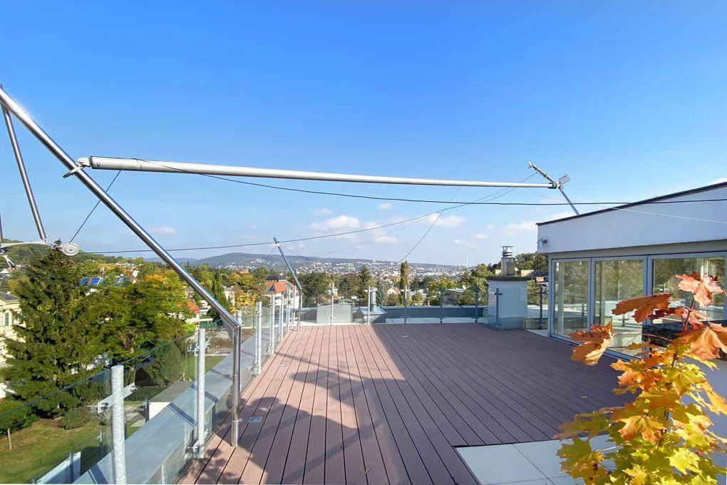 In prominenter Ruhelage zwischen dem Roten Berg und Lainzer Tiergarten befindet sich dieses traumhafte Penthouse mit ca. 200 qm Terrassenflächen. Im gesamten Gebäude befinden sich lediglich 6 Wohneinheiten. Mit dem Privatlift gelangen Sie direkt auf die erste Ebene der Wohnung, wo sich alle wesentlichen Wohnräume befinden. Im westlich ausgerichteten Bereich befindet sich das großzügige und lichtdurchflutete Wohnzimmer mit Kamin sowie eine ca. 39 qm große vorgelagerte Terrasse. Angrenzend befindet sich die moderne und voll ausgestattet Küche mit einem Teppanyaki Grill. Das einzigartige Penthouse bietet drei Schlafzimmer mit zwei hochwertigen Bädern sowie eine möblierte begehbare Garderobe. Zwei der drei Zimmer haben einen direkten Ausgang auf eine weitere ca. 29 qm große Terrasse. Ein praktischer Abstellraum komplettiert das Raumangebot dieser Ebene. Über eine elegante Treppe gelangt man auf die voll verglaste obere Ebene. Diese verfügt über eine Sauna mit Dusche und einer ca. 133 qm großen Dachterrasse mit einem traumhaften Weitblick ins Grüne und das Wiental. Die monatliche Gesamtmiete beträgt EUR 4.592,51 (Miete netto EUR 3.278,95 + BK EUR 560,70 + Akonto für Warmwasser und Heizung EUR 294,12+ USt EUR 458,74). Im Mietpreis sind drei PKW-Stellplätze in der hauseigenen Tiefgarage inkludiert. Als Kaution sind EUR 15.000,-- zu hinterlegen. Die Wohnung wird auf 7 Jahre befristet vermietet.