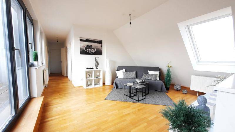 3-Zimmer-Maisonette Wohnung mit Kaufoption Kosten: Finanzierungsbeitrag: € 57.131,33 monatl. Kosten: € 1.215,07 (inkl. BK+Verwaltung+USt.) Zur WIEDERVERMIETUNG gelangt eine ca. 113 m² große 3-ZIMMER-MAISONETTE WOHNUNG im DACHGESCHOSS mit zwei TERRASSEN von jeweils ca. 16 m² und ca. 6 m² sowie einen ca. 7 m² großen Balkon mit Kaufoption im 3. und 4. LIFTSTOCK eines NEUBAU-KOMPLEXES vom Jahr 2011. Als Besonderheit ist hervorzuheben, dass es in dieser kleinen Wohnhausanlage nur insgesamt 4 Wohnungen gibt. RAUMAUFTEILUNG: Eingangsebene: Vorraum Wohnküche mit Ausgang auf die Loggia / Terrasse extra WC Aufgang ins Obergeschoss Obergeschoss: Galerie mit Ausgang auf die Terrasse Schlafzimmer mit Ausgang auf den Balkon Zimmer mit Ausgang auf die Terrasse Bad mit Wanne, Dusche, Waschbecken, Waschmaschinenanschluss extra WC Das Projekt Das lange Suchen hat ein Ende! Sie haben das perfekte Wohnhaus gefunden. Denn die Familienwohnbau hat ein modernes Wohnhaus mit nur 4 Wohnungen samt Garagen im Erdgeschoss errichtet. Hier können Sie sich Ihren Traum eines überschaubaren, privaten Wohnens erfüllen. Die Details Die Zimmer sind mit hochwertigem Parkettboden ausgestattet. Aufgrund der hervorragenden Raumaufteilung auf zwei Ebenen, ergibt sich eine räumliche Trennung von Kochen und Wohnen, da die Galerie als Wohnbereich genutzt werden kann. Die Wohnhausanlage wird mittels Fernwärme beheizt. Im Erdgeschoss befindet sich neben der Garage, welche Platz für 2 PKW bietet, auch ein großzügiger Abstellraum. Hier können Sie Ihre Kinderwägen und Fahrräder einstellen. Die wohnungszugehörigen Einlagerungsräume liegen auch im Erdgeschoss und sind vom Innenhof begehbar. Dort befindet sich auch der Müllraum, welcher mit den Bewohnern des ebenfalls auf der Liegenschaft befindlichen Altbaus geteilt wird. Die Infrastruktur Die gute Lage unweit der Pragerstraße, Nähe zum Erholungsgebiet Marchfeldkanal und Bisamberg lädt zu verschiedenen Freizeitaktivitäten und Spaziergängen ein. Die bekannten Weingebiete Stammersdorf und Strebersdorf sind nicht weit entfernt und ermöglichen die Einkehr bei zahlreichen Heurigen. In der Umgebung befinden sich sämtliche Supermärkte, sowie das Einkaufszentrum „Shopping Center Nord“ und der Franz Jonasplatz mit seinen zahlreichen Geschäften. Mit der Straßenbahnlinie 26 und dem Autobus 33 B gelangt man in Kürze nach Floridsdorf, wo sich die Schnellbahn, U6 und verschiedene weitere Busse und Straßenbahnlinien befinden. Die Nordbrücke ermöglicht für Autofahrer eine rasche Verbindung zum Stadtzentrum... Bezug: kurzfristig beziehbar Vereinbaren Sie unverbindlich einen Besichtigungstermin und machen Sie sich selbst ein Bild von der Wohnung. Wir freuen uns auf Ihren Anruf!!! Energiedaten: Energieausweis: liegt vor HWB: 36,60