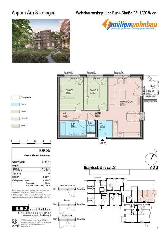 Live Life Long – g´sund leben in der Seestadt Aspern Kosten: Finanzierungsbeitrag: € 34.984,44 monatl. Kosten: € 635,97 (inkl. BK, Verwaltung, Heizkosten und Warmwasser Akonto und USt.) Das Projekt In einem der größten Stadtentwicklungsgebiete Europas – in der Seestadt Aspern – plant die Familienwohnbau die Errichtung von 152 Wohnungen davon 78 geförderten Mietwohnungen, 39 SMART-Wohnungen mit Superförderung und 35 freifinanzierten Eigentumswohnungen. 2 Geschäftslokale werden ebenso errichtet wie eine Musikschule mit Proberäumen und ein Kindergarten. Unter dem Motto „Wohnen + Arbeiten“ finden sich in diesem Komplex neben einer Ordination (Dermatologie), einem Co-Working Space, Ateliers und Wohnungen mit separat zugänglichem Arbeitszimmer auch ein Aktivraum mit einer Gemeinschaftsküche (z. B. zum Abhalten von Workshops). Die Details Auf vier Stiegen entsteht ein ansprechendes Angebot an 2- bis 5-Zimmer-Wohnungen in Größen von 48 m² bis 112 m². Durchdachte Grundrisse, geschmackvolle Ausstattung, Freiflächen wie Balkon oder Terrasse sind ebenso selbstverständlich wie geräumige Kinderwagen- und Fahrradabstellräume. Ein Jugendspielplatz, der frei zugänglich ist, sowie eine Gästewohnung im 1.OG, bieten zusätzlich zahlreiche Möglichkeiten des Austauschs und der Begegnung. Garagenplätze können in der naheliegenden Hochgarage angemietet werden. Die Infrastruktur Mit der Seestadt Aspern ist ein ganzer Stadtteil im Entstehen - in mehreren Etappen verschmilzt die Schaffung von sowohl hochwertigem Wohnraum als auch großzügigen Bereichen für gewerbliche Nutzung zu einem urbanen Gesamtkonzept in dem sich hohe Wohnzufriedenheit mit dynamischer Wirtschaftskraft verbinden. Der künstlich angelegte See ist Namensgeber des Projekts und bietet zahlreiche Möglichkeiten für Freizeitaktivitäten – Entspannung findet man in der Funsportanlage oder im großen Seepark samt riesiger Hundezone. Die Bewohner erwartet hier eine perfekte Kombination aus Urbanität und Lebensqualität. Direkt an der U-Bahn-Station gelegen ist die Seestadt für alle gut zu erreichen. Der Zeitplan Baubeginn: Oktober 2019 Voraussichtliche Wohnungsübergabe: Frühjahr 2022 Energiedaten: Energieausweis: liegt vor HWB: 24,96 HWB Klasse: A