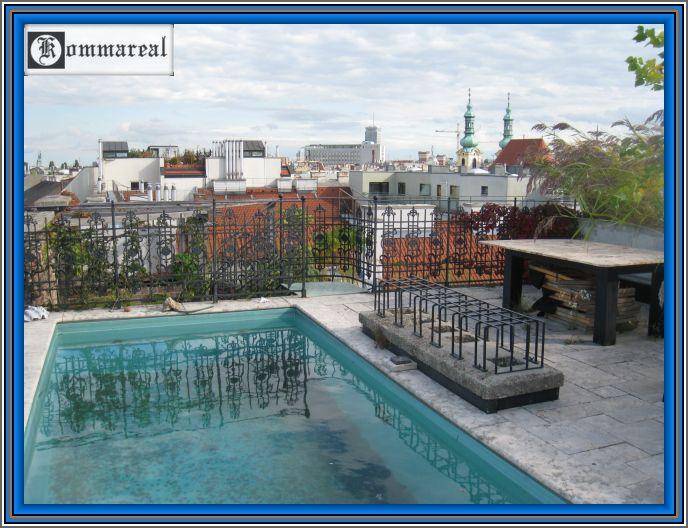 WIEN 1.Bezirk-Nähe RARITÄT: 220m2-DACHTERRASSENPENTHOUSE MIT EIGENEM SWIMMINGPOOL AM DACH im Helmuth Elsner - Stil, 5 Fußminuten zum 1. Bezirk Außergewöhnliches Dachterrassenappartement im Elsner-Stil mit traumhaftem Ausblick auf Wien mit 110 m2 uneinsehbarer Dachterrasse und großem Swimmingpool (mit Gegenstromanlage). Bestehend aus 3 Wohnräumen, 2 Schlafzimmern, Vorzimmer, Küche, 2 Bäder, Sauna (mit separierter Dusche), Frühstücksbalkon. In einem Wohnraum befindet sich ein großer antiker offener Kamin. Die Fußböden sind teilweise Sternparketten mit Eichendielen. Das Penthouse wird mittels Gaszentralheizung beheizt. Das Penthouse befindet sich auf einem Jahrhundertwendehaus mit Lift. Eine Garage ist zumietbar. KOMMAREAL Immobilientreuhand GmbH. Bitte beachten Sie, dass wir nur Anfragen mit vollständigem Namen, Adresse und Telefonnummer bearbeiten. Lage sehr, sehr gut Rarität: Dachpool