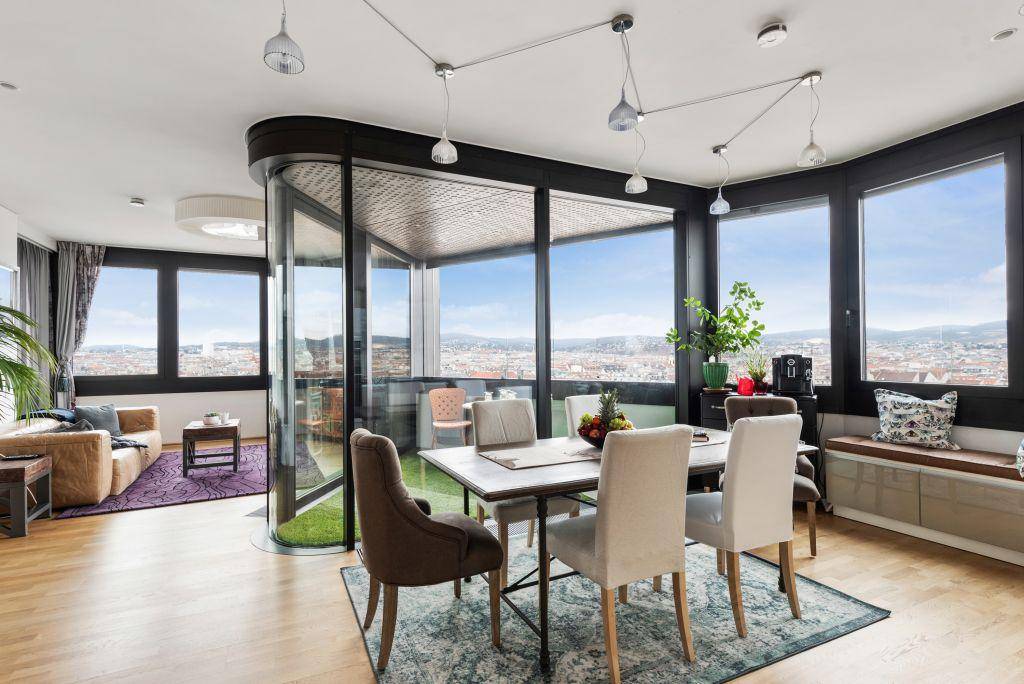 High-end Living auf 102 m2: Topausgestattete Panorama Suite für 2 bis 6 Personen, auf der 10. Etage mit Blick über Wien und für höchste Ansprüche serviciert (wöchentliche Reinigung und Wäscheservice). 2 Schlafzimmer mit je 1 Arbeitsplatz1 Wohnzimmer plus Ausziehcouch + LoggiaVollausgestattete Alno-Küche mit Küppersbusch-GerätenGeschirrspüler, Kaffeemaschine, Wasserkocher, Mixer, Toaster u.a.Zwei Badezimmer (1 Dusche) mit WC, Sauna, WaschtrocknerMultimedia-Equipment (Sat, TV, Radio, Wireless Internet)Nebenräume für Fahrräder, Sportgeräte u.a.Handtücher, Bettwäsche, BademäntelWöchentliche ReinigungGaragenplatz extraLagerräumeIn den Preisen sind alle Nebenkosten enthalten. Bei Aufenthalten bis zu 90 Tagen kommen 3,2 % Ortstaxe hinzu. Energieausweis Dieses Gebäude unterliegt nicht den Anforderungen der EnEV.