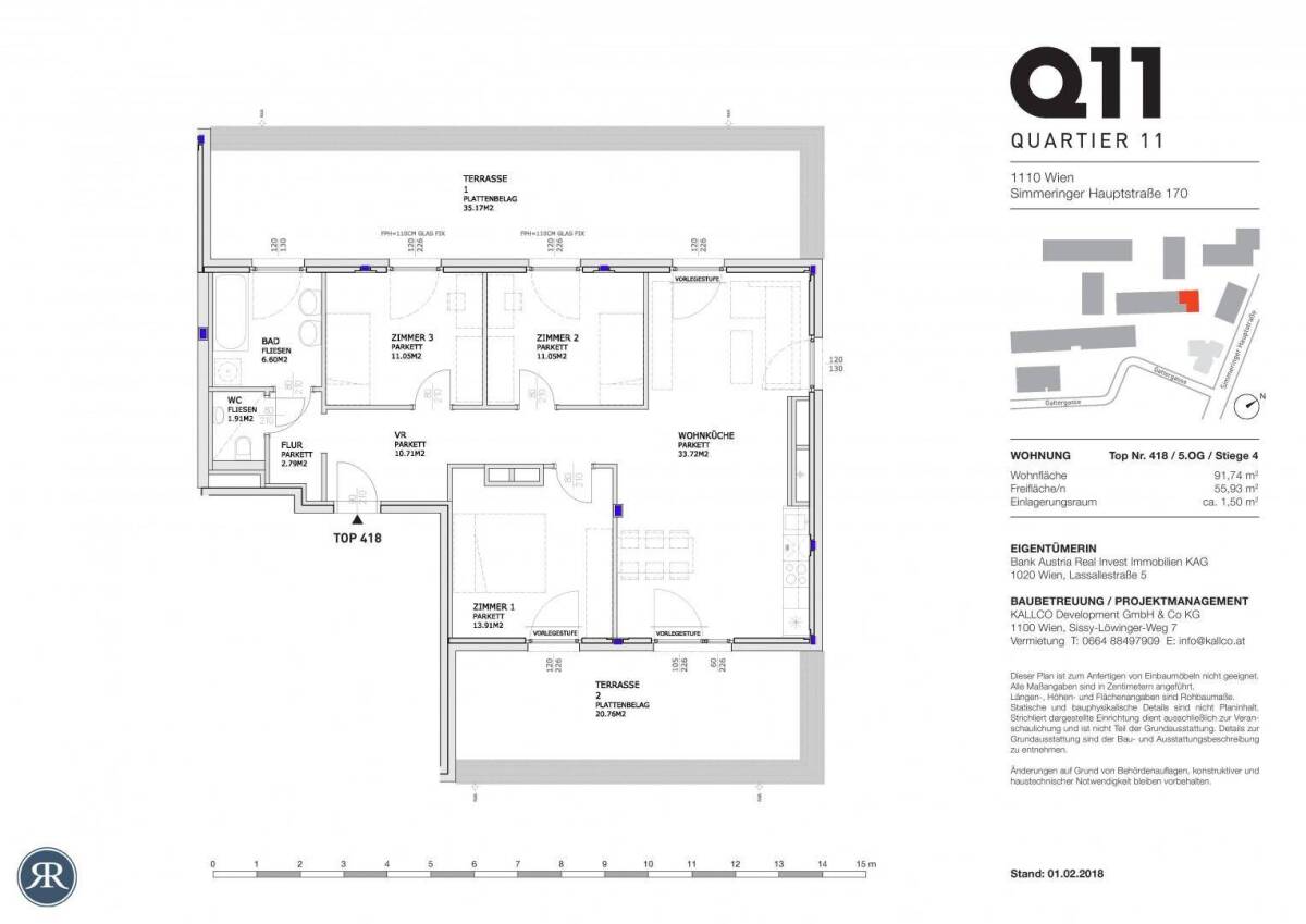 Die Wohnungen im QUARTIER 11 zeichnen sich durch eine Vielfalt an unterschiedlichen Grundrissen und Größen von 43 bis 100 m2 aus. Wählen Sie das Wohnungslayout, das am besten zu Ihnen und Ihrer Zukunftsplanung passt. Ob 1-, 2-, 3- oder 4-Zimmer-Wohnung – alle Wohnbereiche sind bis ins Detail geplant. Jede Wohnung verfügt entweder über Garten, Balkon, Loggia oder Terrasse. Wir haben alle Wohnungen mit modernsten Maßküchen inklusive Geräten, Parkettböden und alle Fenster mit Außenjalousien ausgestattet. Und das Beste ist: alle Wohnungen sind gekühlt.Detaillierte Infos über alle freien Wohnungen sowie Pläne finden Sie unter www.QUARTIER11.at.!!! Alle Innenaufnahmen sind Beispielfotos aus Wohnungen in diesem Projekt.Das Wohnareal QUARTIER 11 besteht aus 8 freistehenden Gebäuden und einem 10-geschoßigen Turm mit markanter Fassade. Großzügige Grünflächen und freundlich gestaltete Plätze verleihen diesem Wohnprojekt ein ganz besonderes Flair in Ruhelage. Die moderne Architektur kombiniert hier attraktives Design und angenehmes Wohngefühl für Ihr neues Zuhause.Das innovative Energiesystem KlimaLoop® mit seiner integrierten Deckenkühlung für alle Wohnungen setzt dabei neue Standards und sorgt für niedrige Energiekosten.Mietdauer: 10 Jahre befristet Kaution: 3 Bruttomonatsmieten Provision: 2 Monatsmieten + 20 % Ust. Garage: € 72,--/Monat (Kaution für Garage: € 220,--)Schicken Sie uns bitte eine Anfrage per Mail. Es werden nur Anfragen mit kompletter Namensnennung (Vor- und Zuname) sowie Telefonnummer beantwortet.Nach Erhalt Ihrer Anfrage übermitteln wir Ihnen das Angebot und können dann gerne eine Besichtigung vereinbaren.Bitte beachten Sie, dass bei Wohnungen, die erst frei werden, eine Besichtigung nur in Abstimmung mit dem/der derzeitigen Mieter/in stattfinden kann.Infrastruktur / EntfernungenGesundheit Arzt <2.000m Apotheke <500m Klinik <4.500m Krankenhaus <4.000m Kinder & Schulen Schule <500m Kindergarten <500m Universität <3.000m Höhere Schule <3.500m Nahversorgung Supermarkt <500m Bäckerei <1.000m Einkaufszentrum <1.500m Sonstige Bank <1.000m Geldautomat <1.000m Post <1.000m Polizei <500m Verkehr Bus <500m U-Bahn <1.000m Straßenbahn <500m Bahnhof <1.000m Autobahnanschluss <2.500m Angaben Entfernung Luftlinie / Quelle: OpenStreetMap