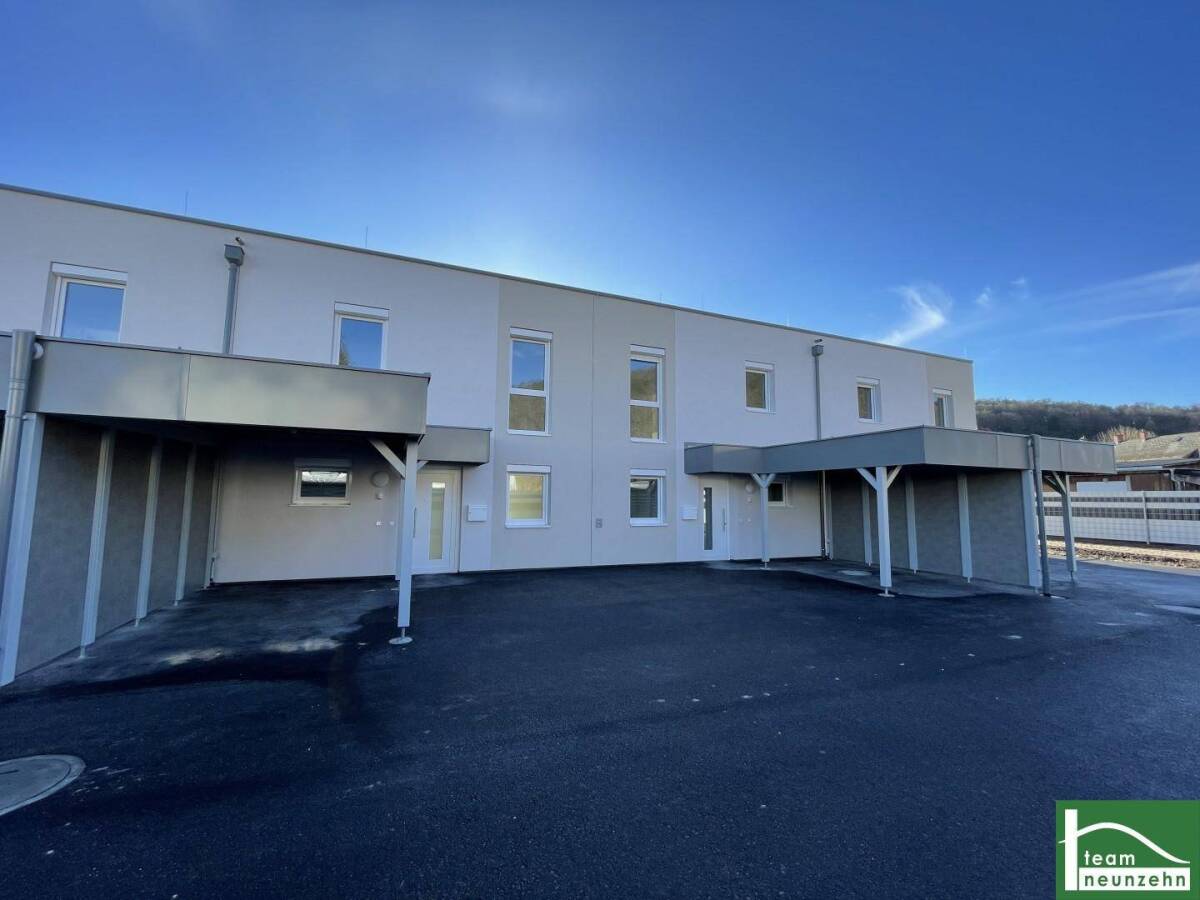 Wohnen im Park – WOHNPARK GLOGGNITZDie 6 Reihenhäuser werden mit 2 Geschossen errichtet. Jedes Reihenhaus verfügt über einen Eigengarten sowie direkten Zugang zur allgemeinen Parkanlage. Vor jedem Reihenhaus befinden sich 2 Stellplätze, davon ist 1 Stellplatz mit einem Carport überdacht.Die 2 Wohnhausanlagen mit je 4 Geschossen und je 17 Wohneinheiten verfügen alle über eine Terrasse, einen Balkon oder einen Eigengarten. Allen Eigentümern ist die Benützung der Parkanlage erlaubt.Im Kellergeschoss der Wohnhausanlage ist eine Tiefgarage (34 PKW-Stellplätze) gebaut worden. Weiters befinden sich Technik- und Einlagerungsräume sowie Fahrradabstellplätze und Kinderwagenabstellraum im Kellergeschoss der Wohnhausanlage.Der von außen zugängliche Müllraum ist im Erdgeschoss situiert.Die Fertigstellung des Projektes ist bereits erfolgt.Die Ausstattungshighlights für Sie kurz zusammengefasst: • ) Fußbodenheizung• ) Nahwärmeversorgung (Fernwärmeanschluss) • ) 3-Fach isolierverglaste Kunststofffenster • ) Eichenparkettboden • ) elektrische Außenrollos• ) hochwertige Sanitäreinrichtung • ) Sicherheitseingangstüre WK1 mit 3KS Mehrfachverriegelung • ) Kinderwagen und Fahrradabstellraum in den AllgemeinbereichenHaus 3Das Haus, welches sich auf 2 Etage erstreckt, verfügt über 4 Zimmer mit knapp 104 m² Wohnfläche zzgl. ca. 13 m² Terrasse und 47 m² Garten und gliedert sich in folgende Raumaufteilung:Erdgeschoss:Eingangsbereich / VorraumWohnküche mit angrenzendem EssbereichZugang auf Terrasse und Garten1 WC1. Obergeschoss:VorraumBadezimmer mit BadewanneSeparates WCAbstellraumSchlafzimmer 1Schlafzimmer 2Schlafzimmer 3Kaufpreis:Der Kaufpreis beläuft sich auf 309.900,-- €.Stellplatz: Der Kaufpreis beläuft sich auf 6.900,-- €.Carport:Der Kaufpreis beläuft sich auf 8.900,-- €.Der Verkauf erfolgt PROVISIONSFREI für den Käufer!Die Verkehrsanbindung glieder sich wie folgt:Sie erreichen in 400m / 5 Gehminuten mehrere Einkaufsmöglichkeiten, Ärtze, Kindergärten, Gaststätten und Kaffeehäuser. Das Landespflegeheim liegt direkt vis-a-vis ebenfalls an der Wiener Straße.Das neue Schulzentrum (Volksschule – Neue Mittelschule – Musikschule), welches 2019 fertiggestellt wurde, ist 1,0km entfernt.Ein großzügiger öffentlicher Kinderspielplatz liegt 400m entfernt.In unmittelbarer Nähe befinden sich mehrere Ausflugsziele wie Rax- Schneeberggebiet, Semmering, Schwimmbad Gloggnitz mit Schwimmteich, Schloss Gloggnitz, diverse Wander- und Spazierwege sowie Skigebiete.Bahnhof Gloggnitz – 450 mBuslinie 1734 – 450 mEnergieausweis:Der Heizwärmebedarf 33,7 kWh/m2a entspricht der Klasse BGerne steht Ihnen Herr Bernhard Koglbauer für weitere Fragen bzw. Besichtigungen unter 0664 38 22 690 zur Verfügung."Leben braucht Raum" teamneunzehn.at Immobilienmanagement GmbH & Co KG www.teamneunzehn.atWir weisen ausdrücklich auf unser wirtschaftliches Naheverhältnis mit dem Abgeber/der Abgeberin hin! Irrtum und Änderungen vorbehalten! Die angeführten Bilder sind Visualisierungen. Abänderungen zur tatsächlichen Ausführung können resultieren. Die auf den Bildern ersichtlichen Einrichtungsgegenstände und Accessoires werden nicht mitverkauft.SuchkundenbetreuungWir wissen, dass die Suche nach der perfekten Immobilie manchmal eine etwas Längere sein kann. Durch unsere professionelle und persönliche Suchkundebetreuung gelangen Sie schneller und bequemer ans Ziel.Sorgenfrei vermieten – Rundum-Servicepakete für AnlegerSie möchten nach Erwerb der Immobilie mit der Vermietung sowie den Mietabrechnungen und eventuellen Fragen während des Mietverhältnisses nicht beschäftigt sein? Wir bieten verschiedene und maßgeschneiderte Konzepte rund um unser Dienstleistungsprogramm »sorgenfrei vermieten«.Finanzierungsservice – Ihre Wunschimmobilie optimal finanziertUm Ihnen bei der Finanzierung Ihrer neuen Wohnung Zeit und Geld zu sparen, stehen Ihnen unsere Finanzierungsprofis mit Rat und Tat zur Seite. Wir führen für Sie unverbindlich und kostenlos einen unabhängigen Vergleich der unterschiedlichen Kreditkonditionen durch und verhelfen Ihnen zum optimalen Angebot.Maßgefertigte Tischlerküchen zum fairen PreisVollkommen transparent mit Fingerspitzengefühl und individuell sorgen wir für die Verwirklichung der auf Ihre Immobilie und Wünsche zugeschnittenen Maßküchen- und Möbel, welche insbesondere durch attraktive Preise bei höchster Qualität punkten können• TOP LAGE* - Wohnen im Park - SONDERWÜNSCHE FÜR BODEN NOCH MÖGLICHInfrastruktur / EntfernungenGesundheit Arzt <500m Apotheke <1.000m Kinder & Schulen Schule <1.000m Kindergarten <1.000m Nahversorgung Supermarkt <500m Bäckerei <500m Einkaufszentrum <500m Sonstige Bank <500m Geldautomat <500m Post <1.000m Polizei <500m Verkehr Bus <500m Bahnhof <500m Autobahnanschluss <1.500m Angaben Entfernung Luftlinie / Quelle: OpenStreetMap