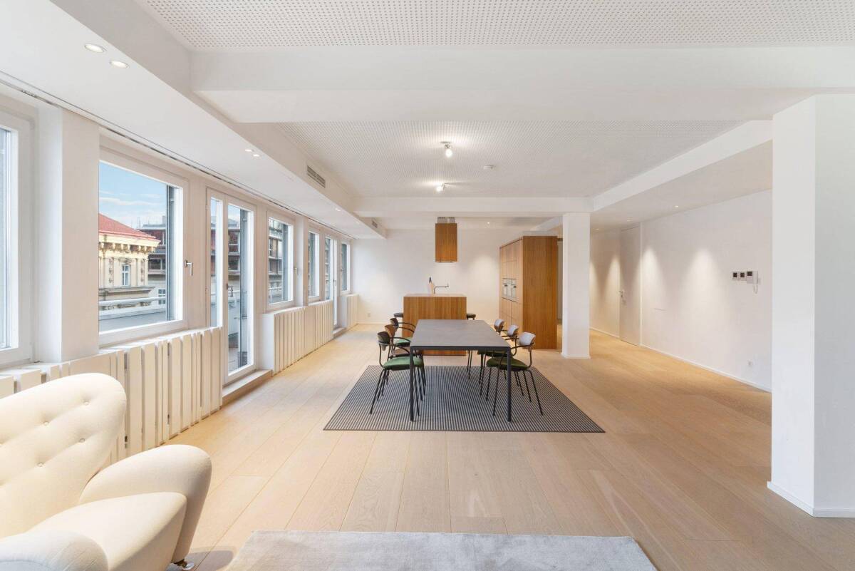 Das gewisse Extra an Design, Qualität und Komfort! Im besonnten sechsten und vorletzten Geschoss befindet sich die moderne Wohnung mit einer Fläche von ca. 202 qm und einer Terrassenfläche von ca. 8,5 qm. Bereits beim Betreten des großzügigen Vorraums öffnen sich die hellen weitläufigen Räumlichkeiten mit einem einzigartigen Charme und warten darauf, erkundet zu werden. Sogleich wird man von einem sonnendurchfluteten, ca. 60 qm großen Wohnsalon begrüßt, der mit seinen großzügigen Bereichen für Wohnen und Essen begeistert. Der hohe Anspruch an Design und Qualität der Ausstattung - etwa der perfekt ausgestatteten Tischlerküche setzt sich in der gesamten Wohnung fort. Die angrenzende Terrasse ermöglicht einen herausragenden und bezaubernden Blick über die Dächer Wiens und unterstreicht die urbane Atmosphäre dieser modernen Wohnung. Durch einen weiteren Vorraum gelangt man in den Privatbereich mit zwei Schlafzimmern die durch einen hochwertigen praktischen Schrankraum getrennt sind und sich ein geschmackvoll eingerichtetes Badezimmer mit Dusche, Badewanne und Doppelwaschbecken teilen. Ein zusätzlicher Raum kann als drittes Schlafzimmer oder Büro genutzt werden. Ein weiteres modernes Badezimmer, ein separates WC, ein Abstellraum, ein Wirtschaftsraum und ein ca. 30 qm großer Kellerbereich komplettieren diesen Wohntraum. Ein PKW-Stellplatz kann in der hauseigenen Garage erworben werden.