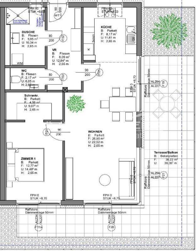 Provisionsfrei für den Käufer! Barrierefrei mit Lift! Exklusive Wohnanlage ca. 400 Meter von der Parktherme Bad-Radkersburg entfernt. Der internationale Murradweg R2 führt direkt an der Wohnanlage vorbei. Das Wohnprojekt (ALT-5) liegt am Rande des Thermenzentrums von Bad Radkersburg in sonniger Ruhelage. In unmittelbarer Nähe beginnt das Freiland und es erschließen sich die weitläufigen Murauen. Die 14 Wohneinheiten sind auf 2 Baukörper (Massivbauweise) verteilt und bestehen jeweils aus 3 Stockwerken. Im Kaufpreis enthalten ist zu jeder Wohneinheit ein Carport-Abstellplatz und ein Kellerabteil oder eine Abstellbox oder ein sonstiger AR zugeordnet. Für eine mögliche Klimaanlage ist bereits die Leerverrohrung bis zum Dach vorbereitet. Im Gebäude A befinden sich 3 Gartenwohnungen, 3 Wohnungen mit Balkon und 2 Penthousewohnungen. Im Gebäude B befinden sich 2 Gartenwohnungen, 2 Wohnungen mit Balkon und 2 Penthousewohnungen. Baukörper B – Top 6 / Penthousewohnung Wohnfläche: 64,58m² Terrassenfläche: 36,18m² Übersicht der verfügbaren Wohnungen: Baukörper A: Top 1 – Gartenwohnung – 69,85m² – € 232.500,-- Top 2 – Gartenwohnung – 46,66m² - € 172.500,-- Top 3 – Gartenwohnung – 65,81m² - € 225.000,-- Top 4 – Obergeschoss – 69,85m² - € 232.500,-- Top 5 – Obergeschoss – 46,67m² – € 172.500,-- Top 6 – Obergeschoss – 65,81m² – € 225.000,-- Top 7 – Penthouse – 67,67m² – € 280.000,-- Top 8 – Penthouse – 67,52m² – € 280.000,-- Baukörper B: Top 1 – Gartenwohnung – 72,08m² – € 247.500,-- VERKAUFT /Top 2 – Gartenwohnung – 91,33m² – € 299.650,-- Top 3 – Obergeschoss – 75,07m² – € 247.500,-- Top 4 – Obergeschoss – 91,92m² – € 299.650,-- Top 5 – Penthouse – 64,58m² – € 265.000,-- Top 6 – Penthouse – 68,66m² –€ 280.000,-- Geplanter Baubeginn: Sommer 2021 Grundriß: Vorraum, Bad, WC, Wohn-Essbereich mit Küche, 1 Zimmer mit Schrankraum Baujahr: 2021 Ausrichtung: Süden Ausstattung: Stockwerk: 2 Böden: Parkett, Fliesen Carport-Abstellplatz.: ja Heizung: Fernwärme Bad :Dusche TV: Sat/Kabel Möbliert: Sanitäreinrichtung Zustand-Wohnung: Erstbezug Zustand-Gebäude: Erstbezug Heizwärmebedarf (HWB): 59,42 fGEE: 1,41 Infrastruktur: 400m bis zur Therme Radkersburg Circa 5 Gehminuten vom Ortszentrum entfernt / 5 Fahrminuten zum Kindergarten/Einkauf / 5 Gehminuten zum Bus / 5 Gehminuten zum Arzt/Apotheke. Gesundheit und Genuss - das finden Sie in der Parktherme Bad Radkersburg: Ob sprudelnde Thermalquellen oder 8 verschiedene Saunen im Saunadorf der Therme oder ein kulinarisches Têt-à-Têt mit fruchtig -frischem Wein in Restaurants und um die Parktherme - Bad Radkersburg hat einiges zu bieten. Für eine Besichtigung und weitere Detailauskünfte stehen wir gerne zur Verfügung.Energiedaten: Energieausweis: liegt vor HWB: 59,42