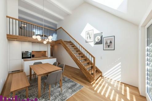 Dorf Stadt Oase Aktiv leben, entspannt wohnenDiese großzügige 3-Zimmer-Maisonette im Dachgeschoss bietet ein durchdachtes Raumkonzept, eine angenehme Wohnatmosphäre und eine hochwertige Ausstattung. Dank der optimalen Ausrichtung ist die Wohnung hell und lichtdurchflutet. Ein Aufzug sorgt für barrierefreien Zugang. Beim Betreten der Wohnung erwartet Sie ein geräumiger Vorraum (18,77 m²), der ausreichend Platz für Garderobe, Schreibtschbereich & Stauraum bietet. Direkt angrenzend befindet sich ein praktischer Abstellraum (2,48 m²). Der Koch-/Essbereich (21,71 m²) überzeugt durch sein offene Gestaltung. Große Fenster lassen viel Tageslicht herein und schaffen eine angenehme Wohnatmosphäre. Das erste Zimmer (11,15 m²) eignet sich perfekt als Schlafzimmer oder Büro. Die angenehme Größe und der hochwertige Parkettboden sorgen für eine gemütliche Atmosphäre. Das zweite Zimmer (13,38 m²) bietet ebenfalls vielseitige Nutzungsmöglichkeiten ob als Kinderzimmer, Gästezimmer oder Homeoffice. Ein modernes Badezimmer (4,89 m²), sowie ein separates WC (2,08 m²) sorgen für zusätzlichen Komfort. Ein besonderes Highlight dieser Wohnung ist die großzügige Galerie (24,50 m²), die sich ideal als Wohn- oder Arbeitsbereich nutzen lässt. Die offene Gestaltung und die zusätzlichen Fensterflächen verleihen diesem Bereich eine besonders luftige und freundliche Atmosphäre. Abgerundet wird das Angebot durch den 4,54 m² großen Balkon & die 11,33 m² Terrasse, die zum Entspannen einladen. Dank der durchdachten Planung bietet diese Wohnung ein angenehmes Wohngefühl und viel Raum zur individuellen Gestaltung.Infrastruktur / EntfernungenGesundheitArzt