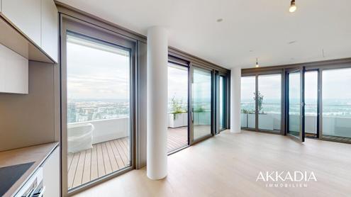 Für eine noch größere Auswahl an Immobilien besuchen Sie www.akkadia.at. Danube Flat ist Wiens höchstes Wohngebäude und ein neues architektonisches Wahrzeichen der Stadt. Direkt an der Neuen Donau gelegen, vereint dieses beeindruckende Projekt modernes Design, höchste Wohnqualität und eine unvergleichliche Aussicht über Wien. Die Bewohner genießen exklusiven Wohnkomfort mit zahlreichen Annehmlichkeiten. Ein Concierge-Service kümmert sich um alltägliche Anliegen, während Fitness- und Wellnessbereiche Erholung auf höchstem Niveau bieten. Gemeinschaftseinrichtungen wie eine stilvolle Lounge, ein Private Cinema sowie eine Eventküche schaffen Raum für Begegnung und besondere Momente. Begrünte Terrassen, moderne Sicherheitskonzepte, eine Tiefgarage mit direktem Zugang und smarte Wohntechnologie runden das hochwertige Angebot ab. Diese moderne, smarte Wohnung befindet sich im 44. Liftstock eines der beeindruckendsten Wohnhochhäuser Wiens und bietet einen atemberaubenden Panoramablick über die Stadt. Auf ca. 49m² Wohnfläche erwartet Sie ein durchdacht gestalteter Grundriss mit hochwertiger Ausstattung. Über ein lichtdurchflutetes Vorzimmer gelangen Sie in die offene Wohn-Küche mit moderner Einbauküche und Zugang zu einem ca. 14m² großen Balkon, der einen beeindruckenden Fernblick eröffnet. Ein Schlafzimmer mit zusätzlichem Balkonzugang, ein stilvolles Badezimmer mit Dusche, eine separate Toilette sowie ein praktischer Abstellraum runden das Raumangebot ab. Auf Grund der EU-Richtlinien zum Fernabsatz- und Auswärtsgeschäfte-Gesetz bitten wir um Ihr Verständnis, dass wir Ihnen seit 13. Juni 2014 die Objekt-Unterlagen erst nach Ihrer Bestätigung, dass Sie unser Tätigwerden wünschen und über Ihre Rücktrittsrechte aufgeklärt wurden, zusenden können. Bevor Sie die Unterlagen zugesendet bekommen, erhalten Sie eine Mail in der Sie diese beiden Punkte bestätigen müssen. Vielen Dank für Ihr Vertrauen!Infrastruktur / EntfernungenGesundheitArzt