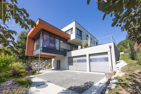 Im naturverbundenen Hadersfeld, das direkt an den Ölberg Klosterneuburg grenzt, sucht dieses einzigartige Einfamilienhaus neue Eigentümer. Leben in der Natur mit dem Luxus der Infrastruktur in unmittelbarer Nähe ein Ort, an dem Sie sich in angenehmer Nachbarschaft zurückziehen können. Diese moderne Liegenschaft mit durchdachter nachhaltiger Technik befindet sich in einem sehr gepflegten Zustand und wurde 2017 erbaut. Das Untergeschoss ist Massivbauweise (Beton-Ziegel) sowie auch das Erdgeschoss - bis auf die Innenwände. Das Obergeschoss ist in Holzriegelbauweise ausgeführt. Sie bietet ein Zuhause mit Wohlfühlcharakter und der Möglichkeit, auch Homeoffice zu integrieren. Weiters komplettieren ein Wirtschaftsraum, eine große Werkstatt, ein Heizraum mit Holzlager sowie eine Garage mit Platz für drei große Autos das Angebot im Innenbereich der Liegenschaft. Im Outdoorbereich bietet ein beleuchteter Pool mit Gegenstromanlage angenehme Abkühlung in der warmen Jahreszeit. Ebenso besteht die Möglichkeit einer Beheizung, um den Pool auch im Winter genießen zu können. Das Wohnhaus erstreckt sich über drei Ebenen: UNTERGESCHOSS: Der Eingangsbereich ist mit einer Garderobe, die Stauraum bis zur Decke und unter der Stiege bietet, bestmöglich ausgestattet. Auch befindet sich auf dieser Ebene der Wirtschaftsraum mit Waschmaschine/Trockner (inkl. Wäscheabwurf und -auffangkorb) und einer Toilette. Vom Eingangsbereich hat man ebenfalls direkten Zugang in die Garage sowie in die dahinterliegenden Räumlichkeiten: Heizraum, Holzlager, Werkstatt und Technikraum für den Pool. In die oberen Etagen führt sowohl eine Stiege als auch ein bequemer Lift. ERDGESCHOSS: Das Erdgeschoss bietet einen sehr großzügigen und sonnendurchfluteten Wohnbereich mit Weitblick ins Grüne wie von einem Art Vogelnest aus. Der Essbereich mit offener Küche und Zugang zur großen Terrasse bzw. zum Garten verstärken das Gefühl mitten in der Natur zu wohnen. Weiters bietet ein praktischer Abstellraum viel Stauraum und eine separate Gästetoilette mit Dusche weiteren Komfort. OBERGESCHOSS: In das Obergeschoss gelangt man sowohl über die Innenstiege als auch mit dem Lift. Zwischen Erdgeschoss und Obergeschoss gibt es zusätzlich noch einen Ausgang direkt in den hinteren Teil des Gartens. Auf der obersten Wohnebene befinden sich insgesamt drei (Schlaf-)Zimmer mit jeweiligen Badezimmern en-suite. Das klassische Elternschlafzimmer hat ein größeres - nur durch eine Glaswand getrennt - angeschlossenes Badezimmer mit freistehender Wanne. Weiters ist diesem Schlafzimmer ein großzügiger Schrankraum vorgelagert. Ebenfalls ist ein praktischer Wäscheschacht in das Untergeschoss vorhanden. Das Grundstück hat eine Fläche von ca. 1.026m² und eine gesamte Wohnnutzfläche von ca. 325m² und gliedert sich nochmal wie folgt: Weitere Ausstattungsmerkmale: Küche mit allen Einbaugeräten von Miele: Induktionsherd Backrohr Dampfgarer Geschirrspüler große Dunstabzugshaube aus Edelstahl mit Beleuchtung Zusatzherd (holzbefeuert) mit Dunstabzug und Beleuchtung Amerikanischer Kühlschrank (inkl. Gefrierteil und Eiswürfelmaschine) weiterer Kühlschrank im Eingangsbereich Josko-Fenster aus Holz/Alu mit 3-facher Isolierverglasung Beschattung: Erdgeschoss: Außenlamellen Jalousien / Raffstores Obergeschoss: Rollläden Insektenschutz: in jedem Raum so montiert, dass Fenster immer geöffnet bleiben können Boden: Eiche - geklebt bzw. schwimmend verlegt (in Kinderzimmern) und Solnofener Steinboden Klimageräte (im Wohnzimmer und den Schlafzimmern) SAT-Anschlüsse LAN (2-fach) Alarmanlage Garten: Pool (8 m x 4 m / Tiefe: 1,4 m auf 2m) mit Abdeckung, Beheizung und Beleuchtung Bewässerungsanlage für Rasen und Tröpfchenbewässerung für Stauden Heizungssysteme und technische Daten - "Kleinkraftwerk": Holzheizung in Kombination mit Pelletsheizung (jeweils 34kW Leistung) Pufferspeicher: ca. 3.000 Liter mit Frischwasserzubereitung für Warmwasser 4 Heizkreise: Fußbodenheizung Radiatoren in den Schlafzimmern, Badezimmern, Handtuchheizung und Stiegenhaus Poolheizung Flächenheizung für die Hausauffahrt Kachelofen und Zusatzherd Solaranlage (ca. 15m²) für Warmwasser und Poolbeheizung PV-Anlage: ca. 12 kW Peak, Speicher ca. 27 kW, jährliche Produktionsleistung 11.000kW + 11kW Wallbox in Garage Zisterne / Hauswasserwerk: Pumpe/Wasserfilter und Speicher aus der Regenwasserzisterne (ca. 15.000 Liter für Haus und Garten) gekoppelt mit Ortswasseranschluss BWT-Enthärtungsanlage Weitere detaillierte Haus- und Ausstattungsmerkmale senden wir Ihnen gerne auf Anfrage. Die derzeitigen monatlichen Kosten von der Gemeinde (Grundsteuer, Wasser, Kanal, Abfall- und Seuchenabgabe) belaufen sich auf brutto EUR 200,--. Weitere Kosten wie z.B. Aufzugwartung, Enthärtungsanlage, etc. stellen wir Ihnen ebenfalls gerne auf Anfrage zur Verfügung. Für ein ausführliches Exposé mit detaillierterer Beschreibung und Objektadresse, ersuchen wir um eine schriftliche Anfrage mit Ihren vollständigen Daten (Vor- und Familienname, Postanschrift und Telefonnummer). Der Vermittler ist als Doppelmakler tätig.Infrastruktur / EntfernungenGesundheitArzt
