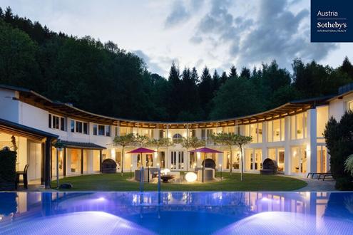 Olymp Ende der 90er Jahre vom Stararchitekten Ronacher entworfen, vor kurzem generalsaniert und modernisiert, steht der halbkreisförmige Prachtbau ins Licht der Sonne ausgerichtet, inmitten rauschender Wälder, mit Grün- und Weitblick. Ohne zeitliche Einschränkung, kann man hier das Leben in all seinen Facetten ausreizen und genießen ! Der Winter hier ist wunderbar still, Rehe kommen ganz nahe ans Haus und ob in der urigen Bauernstube, am Panoramakamin, in der Bibliothek, oder in der Sauna - nichts ist laut, niemand stört und keine Insel im Meer könnte mit dieser famosen Mischung aus Abgeschiedenheit und Zentralität gleichermaßen mithalten ! Die warmen Monate eröffnen die ganze Pracht des großen Grundstückes: der herrliche Innenhof, samt Laube, Barbecue-Küche, Pool, Jacuzzi, Tennisplatz,....- oder die weite Wiese, der Wandelgang, das private Fitnesscenter - alles an diesem Anwesen tut dem Körper, der Seele, Freunden und Verwandten gut ! Das Anwesen findet in Österreich keine Entsprechung. Nirgendwo sonst findet sich holistischer Frei-Zeit-Geist als hier in Kärnten. Das Halbrund des massiven Gebäudes präsentiert im Obergeschoß 4 Schlafzimmer, diverse Verbindungsgalerien und Morgenbalkone und auf Erdniveau Wohnen, Wellness, Wiedererstehen! Im beheizten 10 Meter Pool wird "Austoben im Wasser" zum stundenfüllenden Vergnügen. Nach einem Tennismatch am eigenen Court, wird die Outdoor-Küche angeworfen und göttlich gespeist ! Nachmittags mag die Ruhe im Haus zum Genuss eines guten Buches verlocken, oder eine Trainingseinheit im Fitnessstudio eingelegt werden. Hauptsache man gönnt sich ein Diner am Feuer und vor dem Schlafengehen einen Besuch im Jacuzzi. Viele Feriendomizile würden gerne "besonderen Erholungswert", oder "1-A-Ruhelage" für sich in Anspruch nehmen, aber den gesamten Urlaub (oder so gerne auch für immer) an bloß einer einzigen Adresse verbringen zu wollen - das ist OLYMP ! (Energieausweis ist in Auftrag gegeben) Noch nichts gefunden Wir informieren Sie über geeignete Immobilienangebote noch vor allen anderen. Legen Sie jetzt Ihren individuellen Suchagenten unter folgendem Link an. Wir schicken Ihnen passende Immobilien exklusiv vorab zu. Suchagent anlegen - https://austria-sotheby-s-international-realty.service.immo/registrieren/de Der Vermittler ist als Doppelmakler tätig.Infrastruktur / EntfernungenGesundheitKlinik