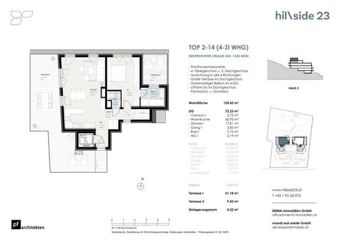 Zum Verkauf steht eine ca. 124 m² große 4-Zimmer-Maisonette in einem Ende 2027 fertig werdenden Neubau. Die Wohnung befindet sich im 4. Obergeschoss/2. Dachgeschoss. Die Wohnung blickt in den Erlebnisgarten Richtung Norden und in die Breitenfurter Strasse Südosten. Zwischen den Maurer Weinbergen und dem Liesinger Bach entsteht dieses traumhafte Wohnprojekt mit zwei Wohnhäusern. In der Anlage gelangen insgesamt 28 freifinanzierte Eigentumswohnungen, die 1 bis 5 Zimmer und Wohnflächen von 50 bis 145 m² bieten. Zu allen Wohnungen gehört entweder ein Balkon, eine Terrasse oder sogar ein Eigengarten. In der hauseigenen Tiefgarage stehen 21 Kfz-Stellplätze davon 8 Komfortdoppelparker zur Verfügung. Die Kombination aus praktischer Fußbodenheizung und -kühlung sowie Markenparkettböden (Eiche) bietet optimalen Komfort und ein angenehmes Wohngefühl. Die teilweise bodentiefen Holz-Alu-Fenster sind sowohl mit 3-fach-Isolierverglasung als auch mit außenliegenden Alu-Raffstores ausgestattet. Die Nassräume sind mit großformatigen Fliesen oder Feinsteinzeug versehen. Die Badezimmer verfügen über Duschen oder Badewannen sowie einen Waschmaschinenanschluss. In den Dachgeschosswohnungen werden Split-Klimaanlagen installiert. Die Beheizung und Warmwasseraufbereitung erfolgt mittels energieeffizienter mittels Luft-Wärmepumpe und wird durch eine Photovoltaikanlage unterstützt. Zu jeder Wohnung ist ein eigenes Kellerabteil zugehörig. Die Küche ist im Kaufpreis nicht enthalten. Den Bewohnern steht eine großzügige Gartenanlage als Ruheoase und Raum für gemeinsame Aktivitäten zur Verfügung. Alle wichtigen Einrichtungen und Geschäfte des täglichen Bedarfs sind nur wenige Gehminuten entfernt. Über den Gartenausgang in die Arabellagasse erreichen Sie das Einkaufszentrum Riverside und das Zentrum von Mauer in kurzer Zeit. Die grüne Umgebung bietet eine einzigartige Kombination aus Natur und urbanem Komfort. Infrastruktur: Billa - 12 Gehminuten entfernt Spar - 12 Gehminuten entfernt Turmöl - 7 Gehminuten entfernt Hausarzt - 5 Gehminuten entfernt Apotheke - 12 Gehminuten entfernt Einkaufszentrum (Riverside) - 15 Gehminuten entfernt Öffentliche Anbindungen: Straßenbahn: 60 - Breitenfurter Str./Liesingbrücke (5 Gehminuten) Bus: 253, 259 Wien Rodaunbrücke (Breitenfurter Straße) (4 Gehminuten) Die 124,43 m²-Wohnfläche bietet wie folgt: 1. Ebene - Vorraum - 2 Schlafzimmer - Badezimmer mit Wanne und Doppelwaschbecken - separates WC samt Handwaschbecken - Abstellraum mit Waschmaschinenanschluss - Balkon: 6,82 m² 2. Ebene - Wohnküche - Schlafzimmer - Badezimmer mit Wanne, Dusche und Doppelwaschbecken - separates WC samt Handwaschbecken - Terrasse 1: 9,43 m² - Terrasse 2: 51,18 m² Werte laut Energieausweis: - HWBREF, SK: 34,5 kWh/m²a (Energieklasse B), - fGEE, SK: 0,69 (Energieklasse A+). - Gültig bis: 31.07.2033 Ab 30% Eigenkapital bieten wir Kreditmöglichkeiten an! Für weitere Informationen sowie Besichtigungen steht Ihnen Christopher Martin unter +43 664 38 300 48 oder office@nagyimmobilien.at zur Verfügung!Infrastruktur / EntfernungenGesundheitArzt