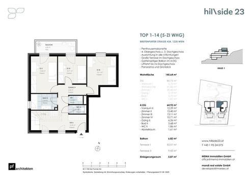Zum Verkauf steht eine ca. 145 m² große 5-Zimmer-Dachgeschosswohnung in einem Ende 2027 fertig werdenden Neubau. Die Wohnung befindet sich im 4. Obergeschoss/2. Dachgeschoss. Die Wohnung blickt in den Erlebnisgarten Richtung Norden und in die Breitenfurter Strasse Südosten. Zwischen den Maurer Weinbergen und dem Liesinger Bach entsteht dieses traumhafte Wohnprojekt mit zwei Wohnhäusern. In der Anlage gelangen insgesamt 28 freifinanzierte Eigentumswohnungen, die 1 bis 5 Zimmer und Wohnflächen von 50 bis 145 m² bieten. Zu allen Wohnungen gehört entweder ein Balkon, eine Terrasse oder sogar ein Eigengarten. In der hauseigenen Tiefgarage stehen 21 Kfz-Stellplätze davon 8 Komfortdoppelparker zur Verfügung. Die Kombination aus praktischer Fußbodenheizung und -kühlung sowie Markenparkettböden (Eiche) bietet optimalen Komfort und ein angenehmes Wohngefühl. Die teilweise bodentiefen Holz-Alu-Fenster sind sowohl mit 3-fach-Isolierverglasung als auch mit außenliegenden Alu-Raffstores ausgestattet. Die Nassräume sind mit großformatigen Fliesen oder Feinsteinzeug versehen. Die Badezimmer verfügen über Duschen oder Badewannen sowie einen Waschmaschinenanschluss. In den Dachgeschosswohnungen werden Split-Klimaanlagen installiert. Die Beheizung und Warmwasseraufbereitung erfolgt mittels energieeffizienter mittels Luft-Wärmepumpe und wird durch eine Photovoltaikanlage unterstützt. Zu jeder Wohnung ist ein eigenes Kellerabteil zugehörig. Die Küche ist im Kaufpreis nicht enthalten. Den Bewohnern steht eine großzügige Gartenanlage als Ruheoase und Raum für gemeinsame Aktivitäten zur Verfügung. Alle wichtigen Einrichtungen und Geschäfte des täglichen Bedarfs sind nur wenige Gehminuten entfernt. Über den Gartenausgang in die Arabellagasse erreichen Sie das Einkaufszentrum Riverside und das Zentrum von Mauer in kurzer Zeit. Die grüne Umgebung bietet eine einzigartige Kombination aus Natur und urbanem Komfort. Infrastruktur: Billa - 12 Gehminuten entfernt Spar - 12 Gehminuten entfernt Turmöl - 7 Gehminuten entfernt Hausarzt - 5 Gehminuten entfernt Apotheke - 12 Gehminuten entfernt Einkaufszentrum (Riverside) - 15 Gehminuten entfernt Öffentliche Anbindungen: Straßenbahn: 60 - Breitenfurter Str./Liesingbrücke (5 Gehminuten) Bus: 253, 259 Wien Rodaunbrücke (Breitenfurter Straße) (4 Gehminuten) Die 145,64 m²-Wohnfläche bietet wie folgt: 1. Ebene - Vorraum - 3 Schlafzimmer - Badezimmer mit Wanne und Doppelwaschbecken - separates WC samt Handwaschbecken - Abstellraum mit Waschmaschinenanschluss - Balkon: 6,82 m² 2. Ebene - Wohnküche - Schlafzimmer - Badezimmer mit Wanne, Dusche und Doppelwaschbecken - separates WC samt Handwaschbecken - Terrasse 1: 9,43 m² - Terrasse 2: 52,51 m² Werte laut Energieausweis: - HWBREF, SK: 34,5 kWh/m²a (Energieklasse B), - fGEE, SK: 0,69 (Energieklasse A+). - Gültig bis: 31.07.2033 Ab 30% Eigenkapital bieten wir Kreditmöglichkeiten an! Für weitere Informationen sowie Besichtigungen steht Ihnen Christopher Martin unter +43 664 38 300 48 oder office@nagyimmobilien.at zur Verfügung!Infrastruktur / EntfernungenGesundheitArzt