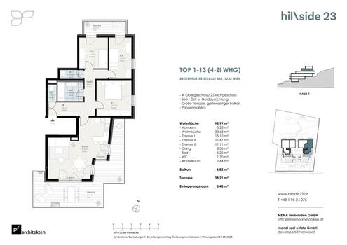 Zum Verkauf steht eine ca. 96 m² große 4-Zimmer-Dachgeschosswohnung in einem Ende 2027 fertig werdenden Neubau. Die Wohnung befindet sich im 4. Obergeschoss/2. Dachgeschoss. Die Wohnung blickt in den Erlebnisgarten Richtung Norden und in die Breitenfurter Strasse Südosten. Zwischen den Maurer Weinbergen und dem Liesinger Bach entsteht dieses traumhafte Wohnprojekt mit zwei Wohnhäusern. In der Anlage gelangen insgesamt 28 freifinanzierte Eigentumswohnungen, die 1 bis 5 Zimmer und Wohnflächen von 50 bis 145 m² bieten. Zu allen Wohnungen gehört entweder ein Balkon, eine Terrasse oder sogar ein Eigengarten. In der hauseigenen Tiefgarage stehen 21 Kfz-Stellplätze davon 8 Komfortdoppelparker zur Verfügung. Die Kombination aus praktischer Fußbodenheizung und -kühlung sowie Markenparkettböden (Eiche) bietet optimalen Komfort und ein angenehmes Wohngefühl. Die teilweise bodentiefen Holz-Alu-Fenster sind sowohl mit 3-fach-Isolierverglasung als auch mit außenliegenden Alu-Raffstores ausgestattet. Die Nassräume sind mit großformatigen Fliesen oder Feinsteinzeug versehen. Die Badezimmer verfügen über Duschen oder Badewannen sowie einen Waschmaschinenanschluss. In den Dachgeschosswohnungen werden Split-Klimaanlagen installiert. Die Beheizung und Warmwasseraufbereitung erfolgt mittels energieeffizienter mittels Luft-Wärmepumpe und wird durch eine Photovoltaikanlage unterstützt. Zu jeder Wohnung ist ein eigenes Kellerabteil zugehörig. Die Küche ist im Kaufpreis nicht enthalten. Den Bewohnern steht eine großzügige Gartenanlage als Ruheoase und Raum für gemeinsame Aktivitäten zur Verfügung. Alle wichtigen Einrichtungen und Geschäfte des täglichen Bedarfs sind nur wenige Gehminuten entfernt. Über den Gartenausgang in die Arabellagasse erreichen Sie das Einkaufszentrum Riverside und das Zentrum von Mauer in kurzer Zeit. Die grüne Umgebung bietet eine einzigartige Kombination aus Natur und urbanem Komfort. Infrastruktur: Billa - 12 Gehminuten entfernt Spar - 12 Gehminuten entfernt Turmöl - 7 Gehminuten entfernt Hausarzt - 5 Gehminuten entfernt Apotheke - 12 Gehminuten entfernt Einkaufszentrum (Riverside) - 15 Gehminuten entfernt Öffentliche Anbindungen: Straßenbahn: 60 - Breitenfurter Str./Liesingbrücke (5 Gehminuten) Bus: 253, 259 Wien Rodaunbrücke (Breitenfurter Straße) (4 Gehminuten) Die 95,99 m²-Wohnfläche bietet wie folgt: - Vorraum - Wohnküche - 3 Schlafzimmer - Badezimmer mit Wanne und Doppelwaschbecken - separates WC samt Handwaschbecken - Abstellraum mit Waschmaschinenanschluss - Balkon: 6,82 m² - Terrasse: 38,21 m² Werte laut Energieausweis: - HWBREF, SK: 34,5 kWh/m²a (Energieklasse B), - fGEE, SK: 0,69 (Energieklasse A+). - Gültig bis: 31.07.2033 Ab 30% Eigenkapital bieten wir Kreditmöglichkeiten an! Für weitere Informationen sowie Besichtigungen steht Ihnen Christopher Martin unter +43 664 38 300 48 oder office@nagyimmobilien.at zur Verfügung!Infrastruktur / EntfernungenGesundheitArzt