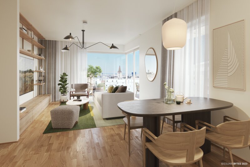 Wohnen im Village - Ankommen auf der Sonnenseite des Lebens. Profitieren Sie jetzt von dem einmaligen Wohn- und Baupaket der Bundesregierung und sparen Sie bis zu ? 11.500 an Gebühren!* (*1,1 % Grundbuchs- u. etwaige 1,2 % Pfandrechtseintragungsgebühr mit Bemessungsgrundlage bis ? 500.000 bei Eigenheimen) Das Wohnprojekt Village im Dritten - PEAK HOMES ist eine moderne Wohnhausanlage mit insgesamt 67 Eigentumswohnungen. Auf Grund der durchdachten Grundrisse und den maßgeschneiderten Raumlösungen bietet das PEAK HOMES Platz für Singles, Familien, Paare und Senioren. Die begrünte Gemeinschaftsterrasse, sowie weitere zahlreiche Gemeinschaftsräume sollen den Bewohnern einen Ort der Begegnung schaffen und die soziale Interaktion fördern. Alle Wohnungen sind mit Videosprechanlagen, einbruchshemmenden WK3-Sicherheitstüren, hochwertigen Eichenparkettböden sowie großformatigen Fliesen ausgestattet. Die Wohnungen werden durch eine sogenannte Bauteilaktivierung beheizt bzw. gekühlt. Ihre Vorteile vom Wohnen im ?Village im Dritten ? PEAK HOMES? helle, lichtdurchflutete Räume Wärmeversorgung über Geothermie mit Wärmepumpenanlagen sowie anteilig über die Fernwärme Wien. Eine gute Erklärung dazu finden Sie unter ,,Videos und Dokumente'' extensiv begrüntes Dach mit Photovoltaikanlage für die Allgemeinflächen künstlerisch ausgestaltete Metallpaneele mit floralem Muster als Sonnen- und Sichtschutz an der Fassade zweigeschossiges Foyer mit Lichtinstallation des österreichischen Künstlers Friedrich Biedermann Coworking-Spaces mit flexibler Büromöblierung ein Gemeinschaftsraum mit Küchenzeile eine Gemeinschaftsterrasse im 6. OG mit Sitzmöglichkeiten Grüngestaltung im Innenhof direkte Lage am Park Kleinkinderspielbereiche Fahrrad- und Kinderwagenabstellräume Bezugsfertig Die Lage eingebettet zwischen Landstraßer Gürtel und Otto-Preminger-Straße, befindet sich diese Wohnhausanlage