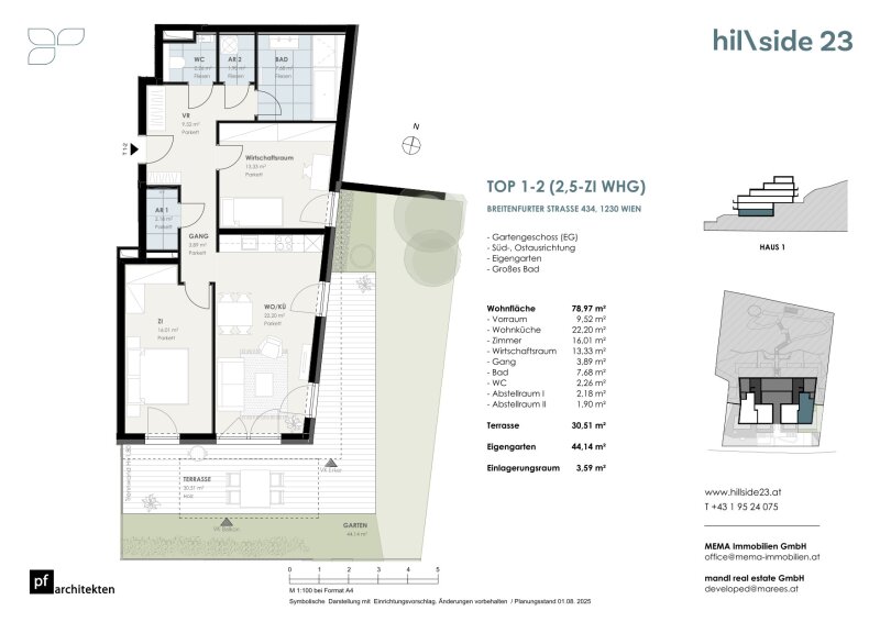 Zum Verkauf steht eine ca. 79 m² große Gartenwohnung mit 2,5 Zimmer in einem Ende 2027 fertig werdenden Neubau. Die Wohnung befindet sich im Erdgeschoss. Die Wohnung blickt in die Breitenfurter Strasse Richtung Südosten. Zwischen den Maurer Weinbergen und dem Liesinger Bach entsteht dieses traumhafte Wohnprojekt mit zwei Wohnhäusern. In der Anlage gelangen insgesamt 28 freifinanzierte Eigentumswohnungen, die 1 bis 5 Zimmer und Wohnflächen von 50 bis 145 m² bieten. Zu allen Wohnungen gehört entweder ein Balkon, eine Terrasse oder sogar ein Eigengarten. In der hauseigenen Tiefgarage stehen 21 Kfz-Stellplätze ? davon 8 Komfortdoppelparker ? zur Verfügung. Die Kombination aus praktischer Fußbodenheizung und -kühlung sowie Markenparkettböden (Eiche) bietet optimalen Komfort und ein angenehmes Wohngefühl. Die teilweise bodentiefen Holz-Alu-Fenster sind sowohl mit 3-fach-Isolierverglasung als auch mit außenliegenden Alu-Raffstores ausgestattet. Die Nassräume sind mit großformatigen Fliesen oder Feinsteinzeug versehen. Die Badezimmer verfügen über Duschen oder Badewannen sowie einen Waschmaschinenanschluss. In den Dachgeschosswohnungen werden Split-Klimaanlagen installiert. Die Beheizung und Warmwasseraufbereitung erfolgt mittels energieeffizienter mittels Luft-Wärmepumpe und wird durch eine Photovoltaikanlage unterstützt. Zu jeder Wohnung ist ein eigenes Kellerabteil zugehörig. Die Küche ist im Kaufpreis nicht enthalten. Den Bewohnern steht eine großzügige Gartenanlage als Ruheoase und Raum für gemeinsame Aktivitäten zur Verfügung. Alle wichtigen Einrichtungen und Geschäfte des täglichen Bedarfs sind nur wenige Gehminuten entfernt. Über den Gartenausgang in die Arabellagasse erreichen Sie das Einkaufszentrum Riverside und das Zentrum von Mauer in kurzer Zeit. Die grüne Umgebung bietet eine einzigartige Kombination aus Natur und urbanem Komfort. Infrastruktur: Billa - 12 Gehminuten entfernt Spar - 12 Gehminuten entfernt Turmöl - 7 Gehminuten entfernt Hausarzt - 5 Gehminuten entfernt Apotheke - 12 Gehminuten entfernt Einkaufszentrum (Riverside) - 15 Gehminuten entfernt Öffentliche Anbindungen: Straßenbahn: 60 - Breitenfurter Str./Liesingbrücke (5 Gehminuten) Bus: 253, 259 ? Wien Rodaunbrücke (Breitenfurter Straße) (4 Gehminuten) Die 78,97 m²-Wohnfläche bietet wie fol