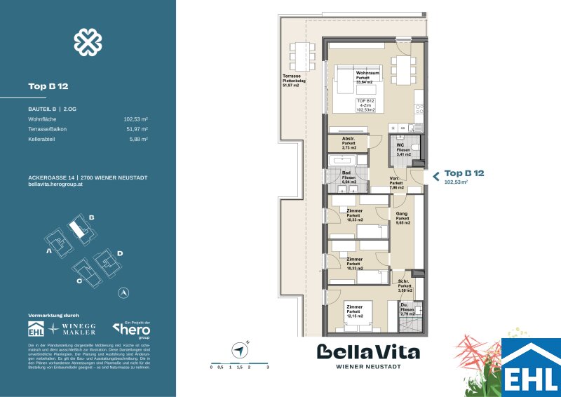 BELLA VITA - modernes und einladendes Zuhause in Wiener Neustadt Erwerb direkt vom Bauträger! In Wiener Neustadt erwartet Sie ein modernes und einladendes Zuhause, das höchsten Ansprüchen gerecht wird. Das Projekt umfasst insgesamt vier Baukörper, die harmonisch in die grüne Umgebung eingebettet sind. Mit einem durchdachten Grünraumkonzept wird eine naturnahe Atmosphäre geschaffen, die Ruhe und Erholung ermöglicht. SCHREIBEN SIE UNS NOCH HEUTE UND SICHERN SIE SICH IHREN GANZ PERSÖNLICHEN TERMIN MIT DEM BAUTRÄGER VOR ORT! Sämtliche Wohnungen beeindrucken nicht nur durch ihre durchdachten Grundrisse, sondern auch durch ihre sehr hochwertige Ausstattung mit viel Liebe zum Detail. Die attraktive Grundrissgestaltung bietet großzügige Wohnbereiche und gemütliche Schlafzimmer. Zudem wurden Gärten, Balkone, Loggien und Terrassen integriert, welche zusätzlichen Freiraum bieten und den Genuss der umliegenden Grünflächen ermöglichen. Das Wohnprojekt befindet sich in einer ruhigen Lage, abseits des städtischen Trubels und dennoch ist die infrastrukturelle Anbindung optimal, welche kurze Wege sowie eine rasche Anbindung an das öffentliche Verkehrsnetz ermöglicht. Erleben sie eine perfekte Symbiose aus modernem Wohnkomfort, Naturverbundenheit und einer idealen Lage. Egal, ob sie eine Vorsorgewohnung als langfristige Investition oder eine Eigentumswohnung zur Eigennutzung suchen, hier finden sie die passende Möglichkeit. Das Projekt 49 Wohnungen 47-111 m² Wohnfläche 75 Tiefgaragenstellplätze 2-4 Zimmer Fahrrad-/Kinderwagenraum Gemeinschaftsgarten Kinderspielplatz Die Ausstattung Die insgesamt 49 Wohneinheiten werden schlüsselfertig übergeben und bieten ausreichend Platz für Ihre persönliche Entfaltung. Hochwertige Materialien und zeitgemäßes Design schaffen ein Ambiente, das den modernen Ansprüchen an Komfort und Ästhetik gerecht wird. Energiesparende Fußbodenheizung großflächige Fenster mit 3-fach Wärmeschutzglas Hebe-Schiebetüren Außenliegender, elektrischer Sonnenschutz Großformatige Fliesen in Bäd