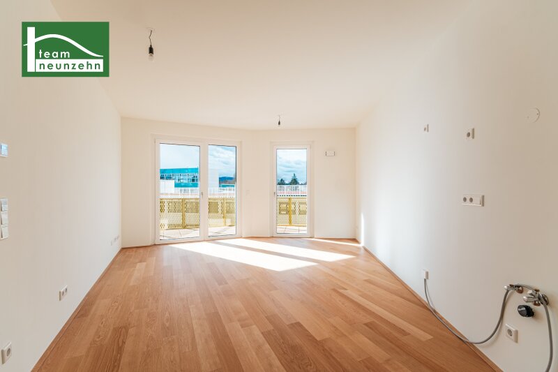 ?Hirschfeld ? Naturnah wohnen?Die gegenständliche Liegenschaft im Projekt ?Hirschfeld ? Naturnah wohnen? wurde im Jahr 2025 fertiggestellt und bietet Ihnen hochwertige Eigentumswohnungen und KFZ-Stellplätze.Die Wohnungen verfügen über 2-4 Zimmer und Wohnflächen von ca. 45m2 ? 96m2 zzgl. großzügigen Freiflächen von mindestens 9m2.Das Projekt grenzt nördlich an ein idyllisches Wald- und Wiesengebiet und südlich an die Gerasdorfer Straße. Auf Grund der Lage des Gebäudes in zweiter Reihe ist ein ruhiges Wohnambiente garantiert. Durch die vorhandene Infrastruktur und Nahversorgung eignen sich die Wohnungen sowohl für Familien als auch für Singles. Der Marchfeldkanal ist fussläufig in ca. 10 Minuten und die U-Bahn-Linie U1 - Leopoldau mit dem Bus in ca. 15 Minuten zu erreichen. Folgende Annehmlichkeiten werden Sie nicht mehr missen wollen:provisionsfreier Verkauf sofort beziehbar hochwertige und energieeffiziente Ausstattung (Fussbodenheizung- und Kühlung über Geothermie/Wärmepumpe, Sonnenschutz,?) Bauausführung durch das renommierte Bauunternehmen ?Strabag? durchdachte Grundrisse und Raumhöhen von ca. 2,60 (Regelgeschoss) ? 2,80m (EG + DG) Umfassende Allgemeinbereiche (Kinderwagen- und Fahrradraum, Spielplatz, modellierte Spielwiese mit Bäumen, Gemeinschaftsraum..) Ausstattungsstandard:Beim gegenständlichen Projekt steht vor allem der Punkt ?Energieeffizienz? im Mittelpunkt. Demnach wurde der Niedrig-Energie-Haus-Standard mit der Klima-aktiv-Zertifizierung ?Silber? erreicht.Fussbodenheizung- und Kühlung über Geothermie/Wärmepumpe PV-Anlage am Dach Hauseigene SAT-Anlage Gegensprechanlage 3-fach isolierverglaste Kunststoff-Alu-Fenster inkl. elektrischer Raffstores Sicherheitstüren inkl. Reedkontakt im EG und DG für die Nachrüstung einer Alarmanlage Parkettboden Eiche Hochwertige Sanitärausstattung mit bodenebener, gefliester Dusche bzw. Badewanne (je nach Ausführung im Plan) Kemperventil auf Freiflächen Kellerabteil bei jeder Einheit E-Ladestation kann nachgerüstet werden Garagenstellplätze Wohnung Top 18:Die Wohnung mit ca. 45,19 m² Wohnfläche und einem Balkon mit ca. 16,71 m² befindet sich im 2. Obergeschoss und gliedert sich in folgende Raumaufteilung:Vorraum: ca. 4,38 m²