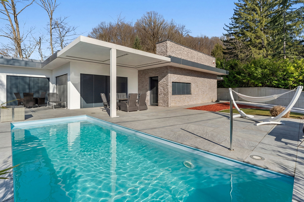 Exklusives Wohnen in Grünruhelage ? Stilvolle Villa im 14. Bezirk von Wien! Inmitten der begehrten Grünruhelage des 14. Bezirks entfaltet sich diese repräsentative Villa auf einem weitläufigen Grundstück von 910 m² . Die Villa erstreckst sich auf zwei Ebenen mit einer Wohnnutzfläche von rund 237 m². Großflächige Fenster holen die Natur ins Haus, und jeder Blick ins Grüne erinnert daran, wie wertvoll Ruhe sein kann. Der großzügige Wohnbereich mit Kamin bildet das Herzstück des Hauses: Offen, repräsentativ und dennoch behaglich. Die moderne Designküche begeistert mit hochwertigen Geräten der Marke Gaggenau und vereint anspruchsvolles Design mit höchster Funktionalität - hier wird Kochen zum Genuss! Direkt angrenzend befindet sich eine praktische Speis mit integrierter "Dirty Kitchen", der zusätzlichen Platz für Vorbereitung, Aufbewahrung und alltägliche Küchenarbeiten bietet und damit für eine klare, aufgeräumte Hauptküche sorgt. Weiters befindet sich auf dieser Ebene das ruhig gelegene Masterschlafzimmer mit elegantem Badezimmer en suite samt freistehender Badewanne und Regendusche. Ein weiteres Zimmer mit eigenem Bad en suite sowie ein Ankleide-/Abstellraum ergänzt diese Ebene. Ein separates Gäste-WC rundet das Raumangebot ab und bietet zusätzlichen Komfort. Der rund 622 m² große Garten ist eine grüne Oase der Erholung. Die weitläufige Sonnenterrasse erweitert den Wohnraum ins Freie und wird zum Mittelpunkt sommerlicher Lebensfreude. Ein Highlight ist der Outdoor-Pool, perfekt für erfrischende Momente an warmen Tagen. Der angrenzende Lounge-/Relaxbereich mit Beschattung lädt zum Entspannen ein ? ob beim Frühstück oder beim Sundowner in privater Atmosphäre. Hier genießen Sie absolute Ruhe, Privatsphäre und Naturverbundenheit ? und das nur wenige Minuten vom urbanen Leben entfernt. Das Untergeschoss präsentiert sich als eigenständiges Gästeappartement mit separatem Eingang und bietet Ihnen ein Höchstmaß an Flexibilität. Auf dieser Ebene befinden sich zwei geräumige Zimmer, ein Badezimmer mit Badewanne sowie eine Kitchenette. Die durchdachte Raumaufteilung schafft vielseitige Nutzungsmöglichkeiten und unterstreicht den hohen Wohnkomfort dieser Immobilie. Für komfortables Parken stehen eine Garage sowie ein Carport zur Verfügung und vervollständigen dieses attraktive Immobilienangebot. Diese Villa ist perfekt für Fa