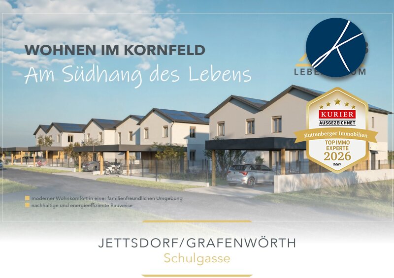 Wohnen im Kornfeld ? modernes Zuhause in Jettsdorf bei Grafenwörth Fertigstellung in Kürze (Frühling 2026)! In ruhiger Lage der Schulgasse in Jettsdorf bei Grafenwörth entsteht mit dem Wohnprojekt ?Wohnen im Kornfeld? eine hochwertige Reihenhausanlage mit insgesamt sieben modernen Einheiten. Das Projekt verbindet zeitgemäßen Wohnkomfort mit einer naturnahen Umgebung und bietet ein ideales Zuhause für Familien, Paare oder alle, die großzügiges Wohnen im Grünen mit guter Anbindung schätzen. Die Häuser überzeugen durch durchdachte Grundrisse, helle Wohnräume und private Freiflächen. Großzügige Terrassen und Eigengärten schaffen zusätzlichen Lebensraum im Freien und laden zum Entspannen ein. Gleichzeitig sorgt eine moderne Ziegel-Massivbauweise mit hochwertiger Ausstattung für langlebige Wohnqualität und ein angenehmes Wohnklima. Besonderes Augenmerk wurde auf eine nachhaltige und energieeffiziente Bauweise gelegt. Die Beheizung erfolgt über eine Luft-Wasser-Wärmepumpe mit Fußbodenheizung, ergänzt durch Photovoltaikanlagen auf den Dächern. Diese Kombination ermöglicht eine moderne und zukunftsorientierte Energieversorgung. Auch im Außenbereich bietet das Projekt hohen Wohnkomfort: Zu jeder Einheit gehören ein Carport mit zwei PKW-Stellplätzen, vorbereitete E-Ladestellen sowie praktische Abstellräume. Die Gärten werden begrünt und bieten ausreichend Platz für Freizeit, Familie und Erholung. Die Lage in der Marktgemeinde Grafenwörth verbindet ländliche Lebensqualität mit einer guten Infrastruktur. Kindergarten, Schulen, Einkaufsmöglichkeiten, Ärzte sowie zahlreiche Freizeitangebote befinden sich in der Umgebung. Dank der guten Verkehrsanbindung sind sowohl Krems als auch Wien bequem erreichbar. ?Wohnen im Kornfeld? steht für modernes, nachhaltiges Wohnen in einer lebenswerten Region ? ein Zuhause, das Ruhe, Natur und zeitgemäßen Wohnkomfort harmonisch miteinander verbindet. Das Projekt besteht aus sieben Einheiten: Haus 1: Wohnfläche 128,58 m² / 4,5 Zimmer / Kaufpreis 557.000,- Haus 2: Wo