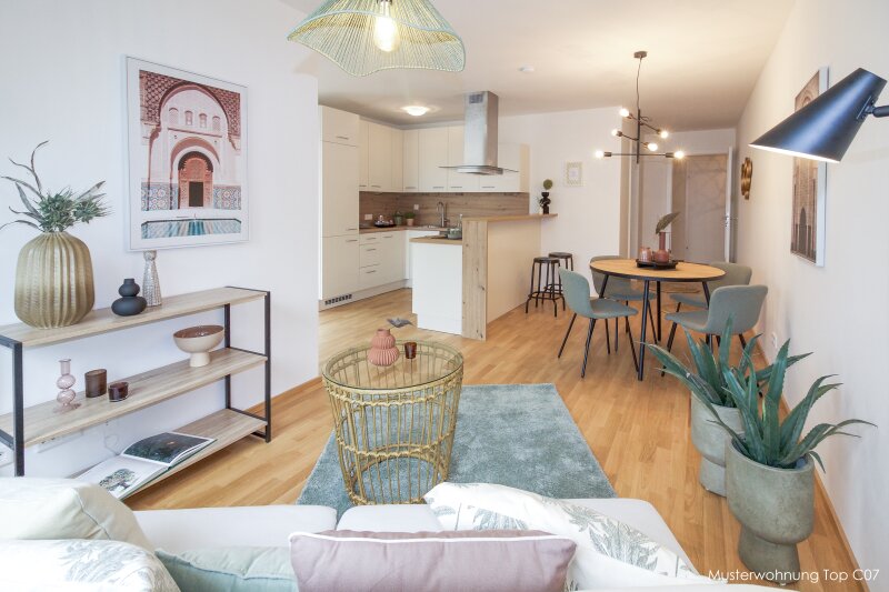 Der Trattmannspark besteht aus insgesamt sechs Baukörpern, wovon zunächst im ersten Bauabschnitt die Häuser C & F errichtet werden. Darin befinden sich durchdacht geplante Eigentumswohnungen mit zwei bis vier Zimmern und ca. 30 bis 90 m². Sämtliche Wohnungen sind mit einem großen Balkon oder einem Garten ausgestattet und so ausgerichtet, dass Sie die Sonne mit Ihren Liebsten genießen können. Bei allen Wohnbauprojekten ist uns seit jeher wichtig, dass Sie sich nicht nur in Ihrer Wohnung, sondern auch mit dem ?Drumherum? wohl fühlen. So wird das Haus bspw. mit einer komfortablen Tiefgarage ausgestattet und per Aufzug erschlossen. Besondere Highlights sind die unterschiedlichen Frei-, Spiel- und Erholungsflächen, an denen sich die ganze Familie erfreuen wird.WERTE FÜR GENERATIONEN Diese großzügige 3-Zimmer Wohnung im 2. Obergeschoss überzeugt durch eine einladende Atmosphäre, durchdachte Annehmlichkeiten und höchste Qualität. Ein geräumiger Eingangsbereich bietet ausreichend Platz und ein praktischer Abstellraum sorgt für Ordnung und bietet zusätzlichen Stauraum. Das mit hochwertigen Fliesen und Armaturen ausgestattete Badezimmer lädt mit seiner Badewanne zum Entspannen und Regenerieren ein und ein separates Gäste WC sorgt für entsprechende Privatsphäre. Die zwei gemütlichen Schlafzimmer bieten genügend Platz für Ruhe und Erholung. Der offene Wohn- und Essbereich ist das Herzstück der Wohnung und der ideale Ort für gesellige Stunden mit Familie und Freunden. Ein weiteres Highlight ist der nach Südosten ausgerichtete Balkon, der mit einem herrlichen Ausblick und viel Sonnenlicht zum Verweilen im Freien einlädt. Insgesamt bietet diese Wohnung ein angenehmes und komfortables Wohnambiente, das sowohl für Paare als auch für kleine Familien ideal ist. Die traditionelle Ziegelbauweise, sorgfältig ausgewählte Ausstattungsdetails und eine harmonische Architektursprache gewährleisten eine nachhaltige Wertbeständigkeit für Generationen. WOHNHIGHLIGHTS IM ÜBERBLICK: Voll ausgestatteter Fitnessraum und Co-Working-Bereich Glasfaser-Internetanschluss Ökologische Bauweise mit Photovoltaikanlage und Pelletheizung Hochwertiger Echtholzparkettboden und ansprechende Fliesen PKW-Stellplätze in der Tiefgarage mit Lademöglichkeit Massivbauweise - Ziegelmauerwerk Harmonische